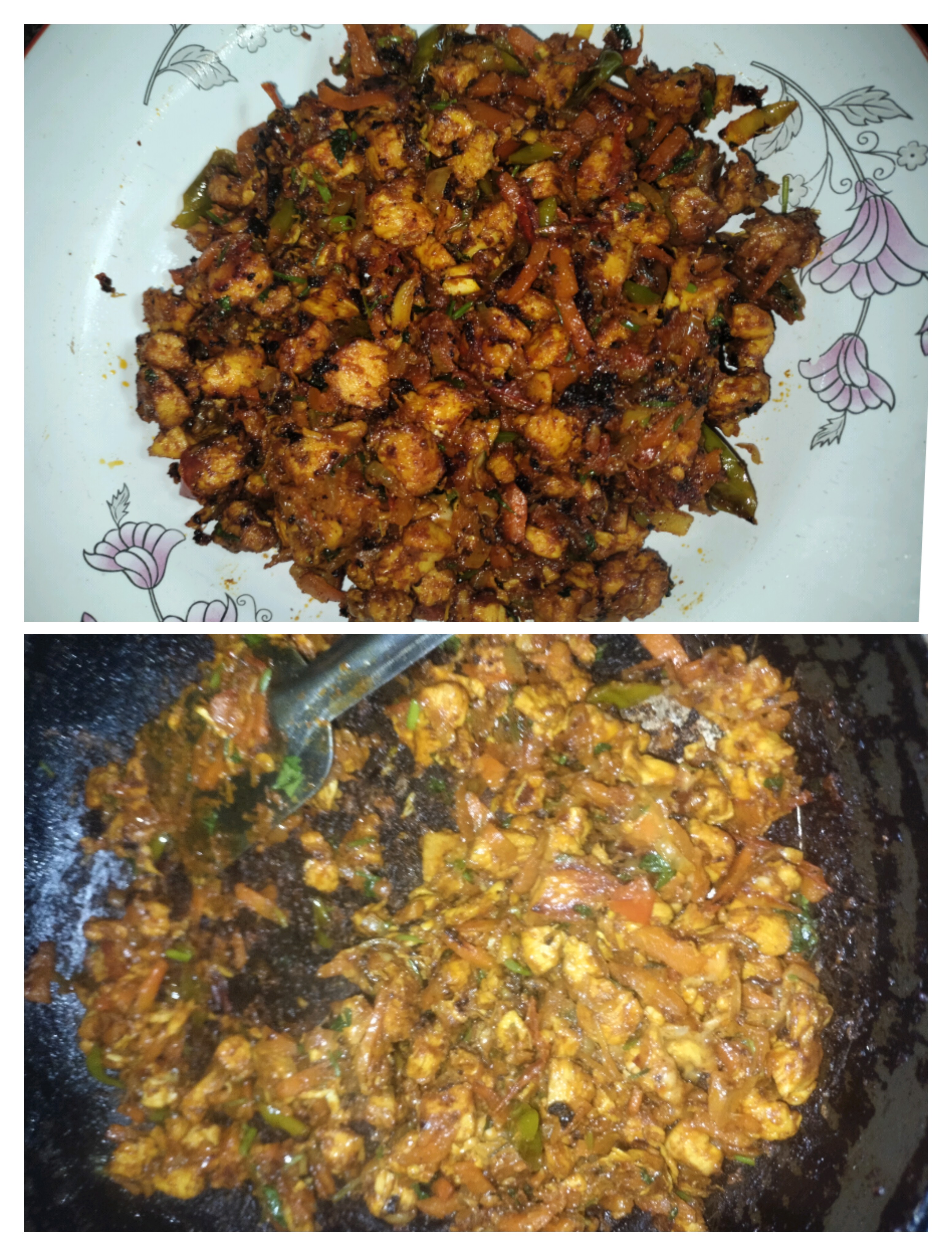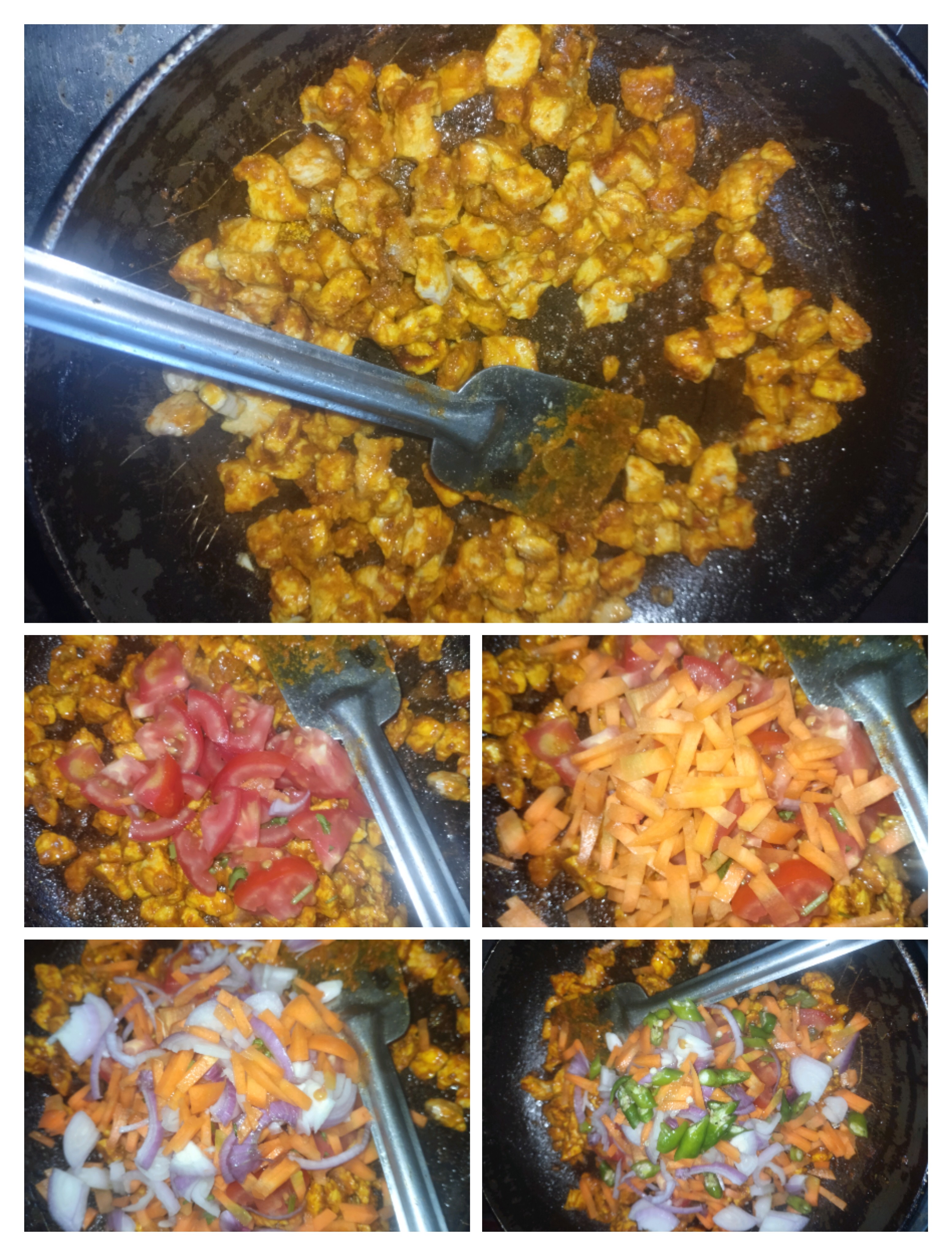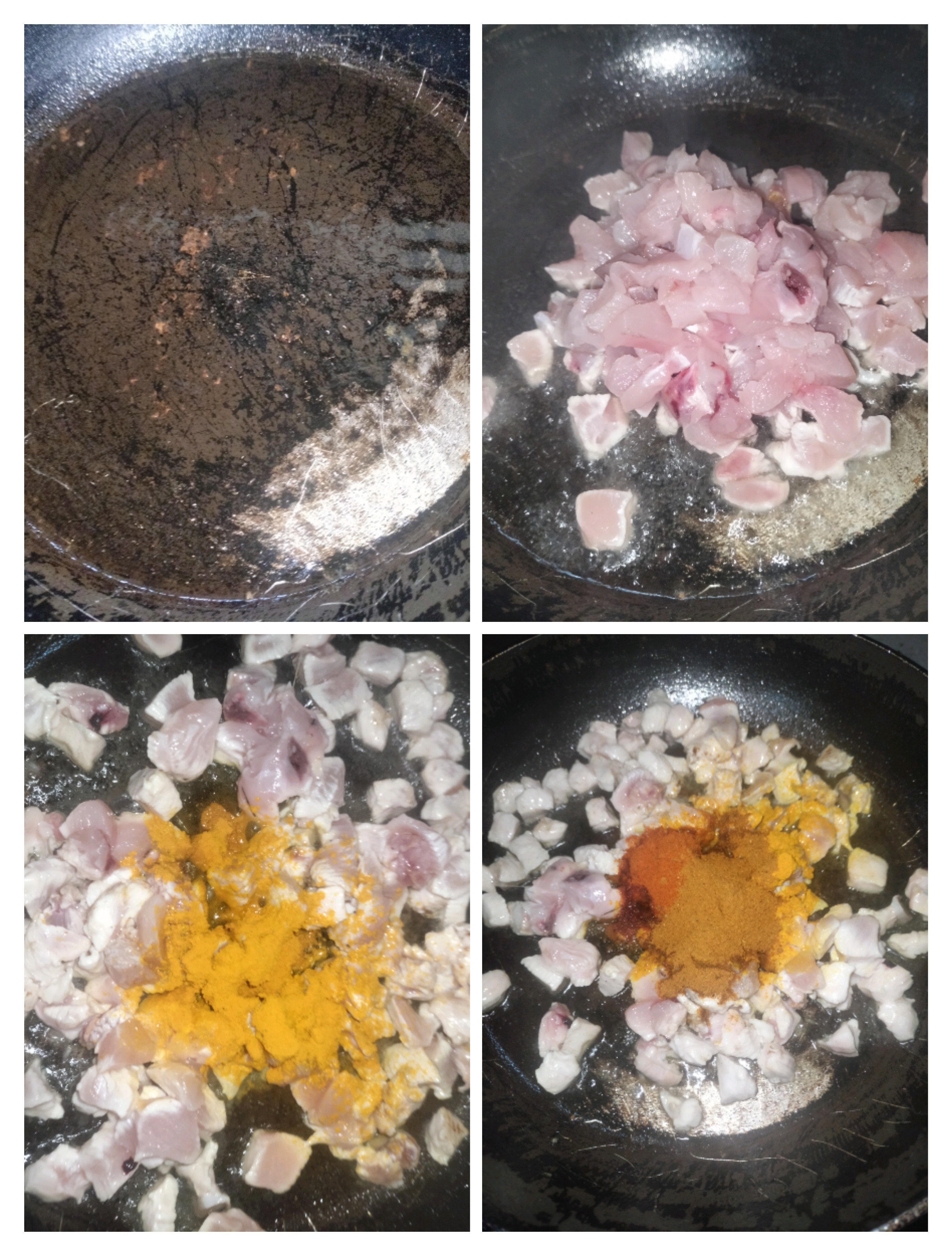 এরপর আমি চুলায় একটা ফ্রাইপ্যান বসিয়ে দিলাম। এর মধ্যে পরিমাণ মতো তেল দিয়ে দিলাম। এরপর আমি ছোট ছোট করে কেটে রাখা চিকেন গুলো দিয়ে দিলাম । এরপর এর মধ্যে সবগুলো মসলা দিয়ে দিলাম। এগুলোকে একটু নেড়েচেড়ে নিব।