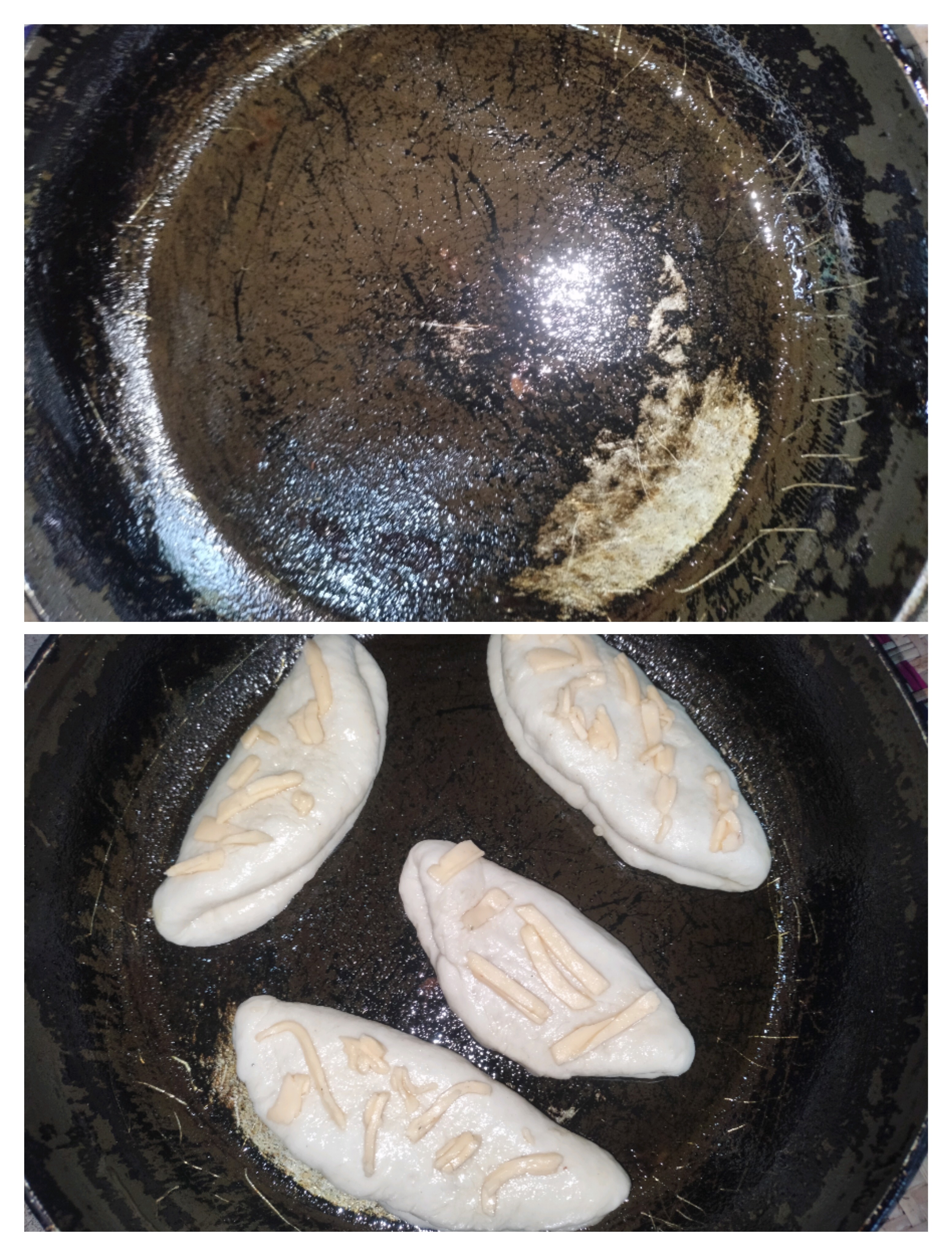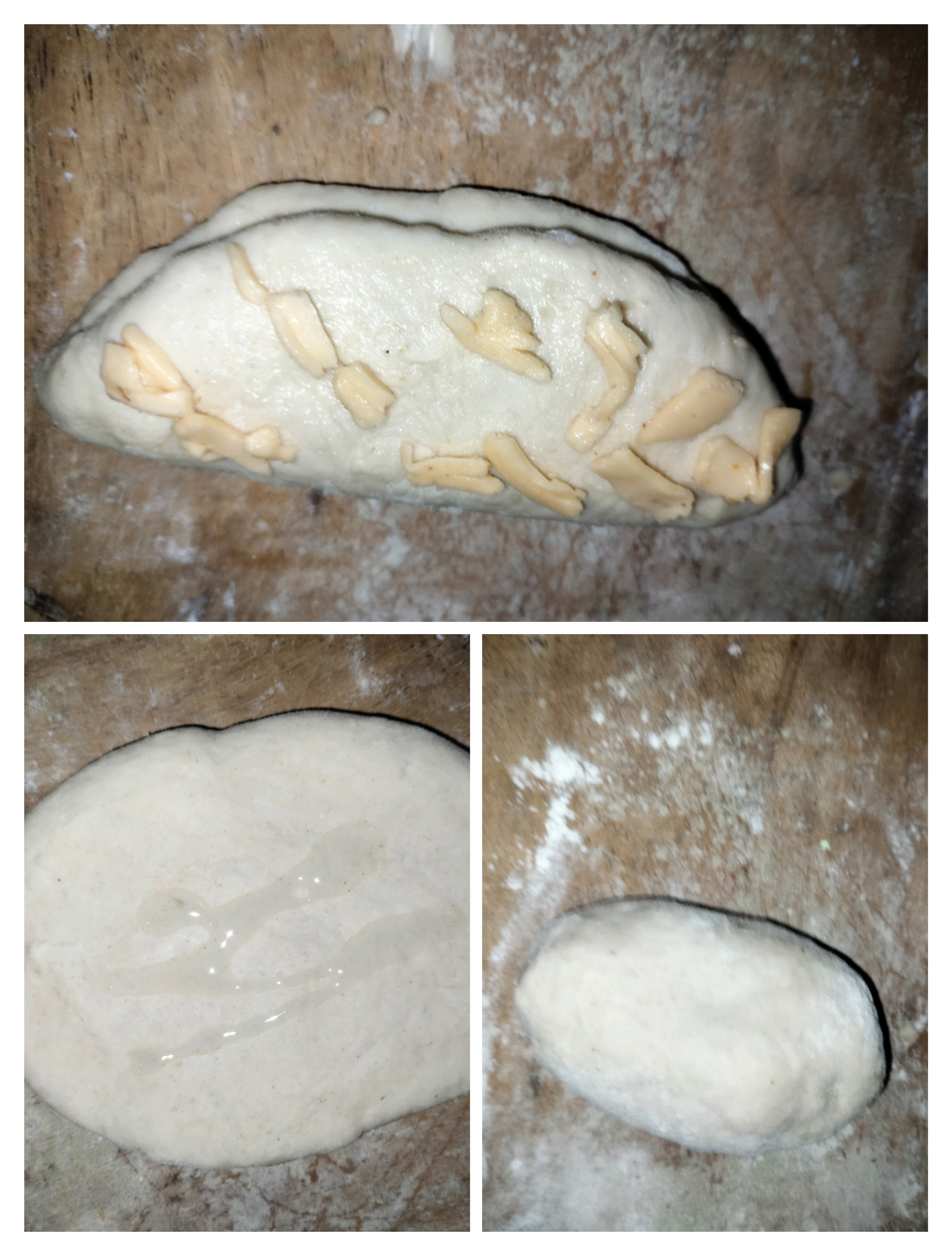 এরপর আমি একটা নিয়ে এটাকে সামান্য পরিমাণে বেলে তারপর ভেতরের অংশের তেল ব্রাশ করে নিলাম। এরপর একটা ভাজ দিয়ে উপরের অংশে তেল ব্রাশ করে নিলাম। এরপর আবারও উপরের অংশে কয়েকটা চিজের টুকরো দিয়ে দিলাম। এভাবে আমি সবগুলো তৈরি করে নিলাম