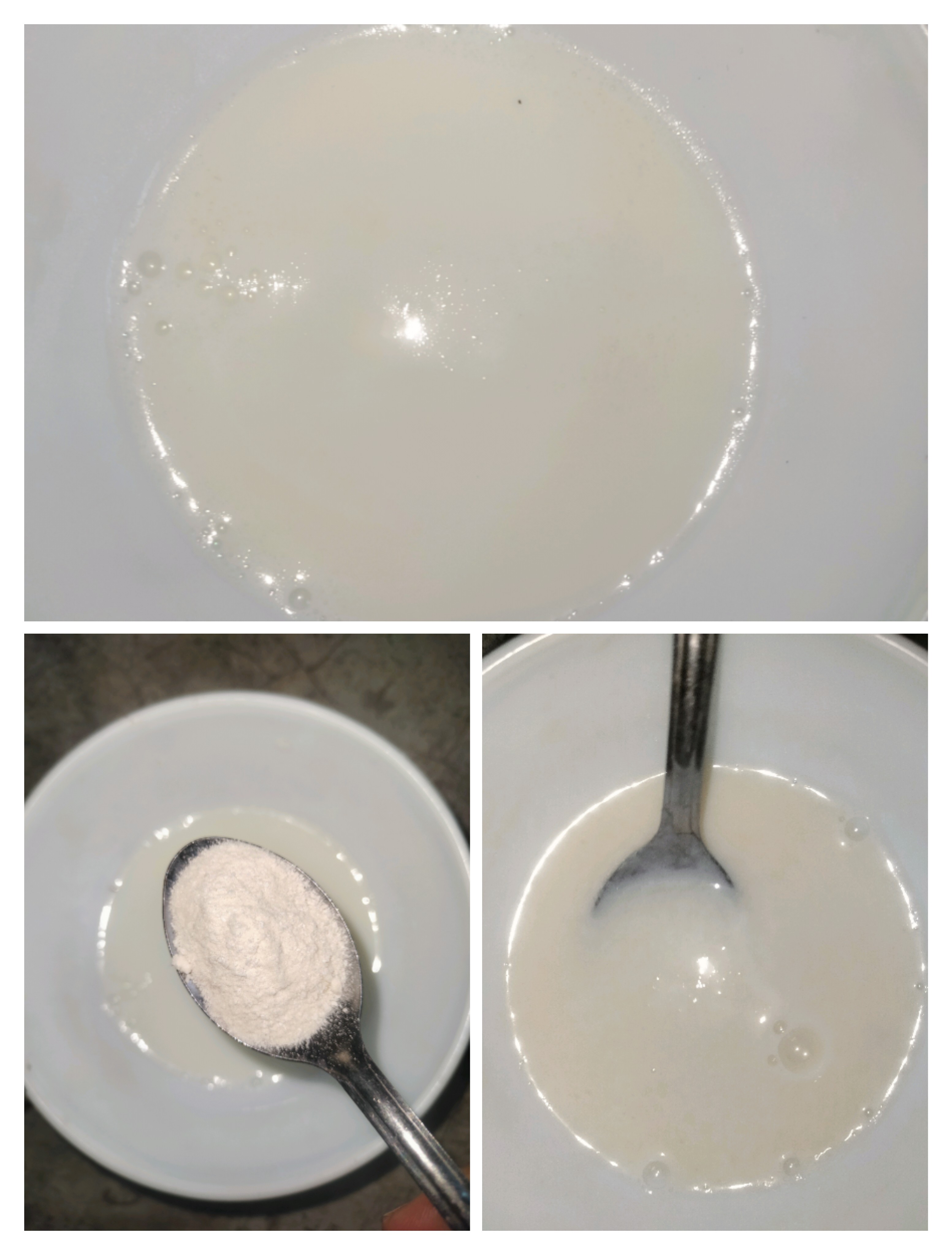 এরপর আমি ফুটন্ত দুধ থেকে কিছুটা পরিমাণে একটা বাটিতে নিয়ে নিলাম। এর মধ্যে আমি আগার আগার পাউডার দিয়ে ভালোভাবে মিশিয়ে নিলাম।