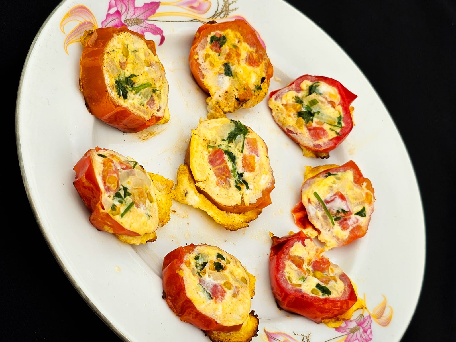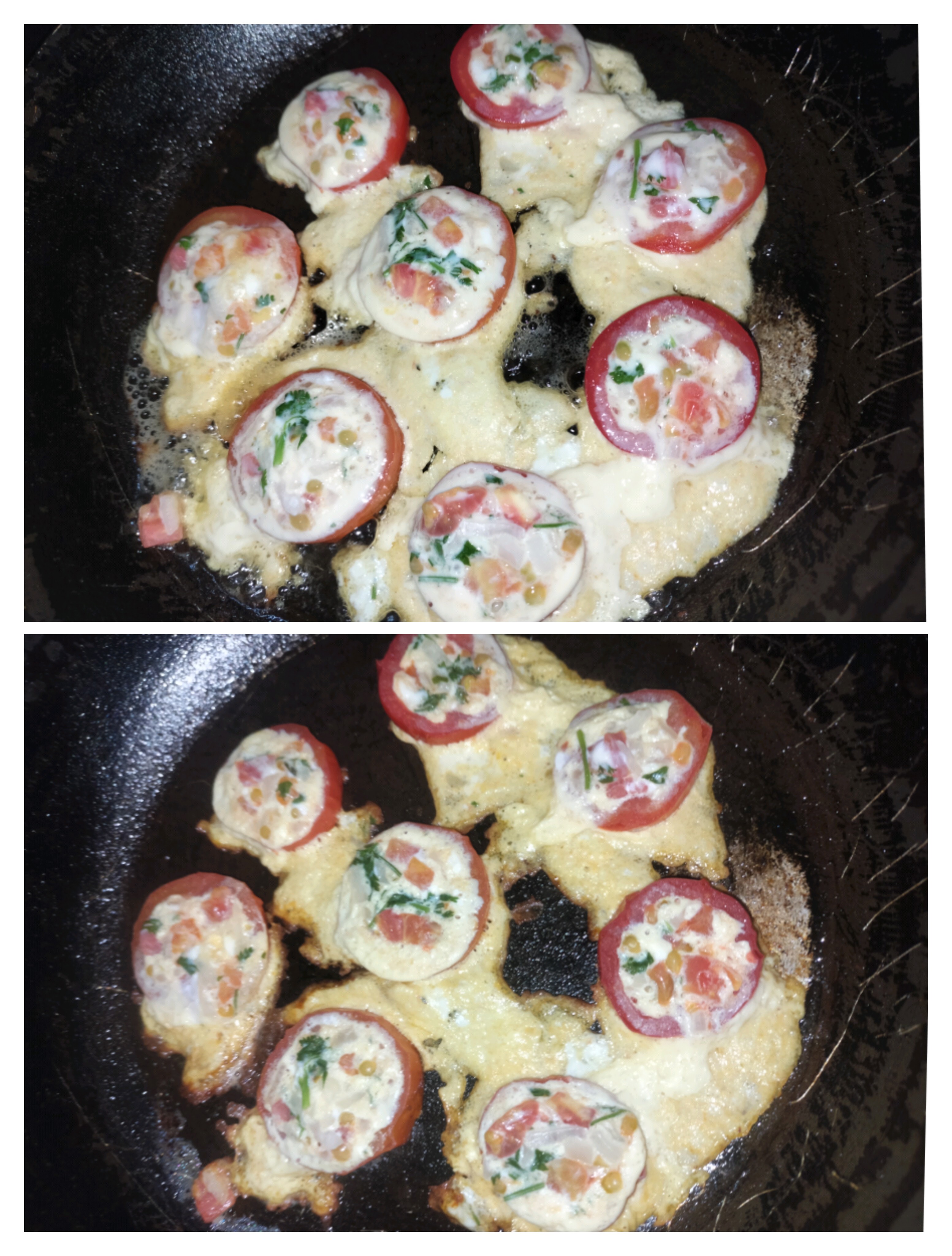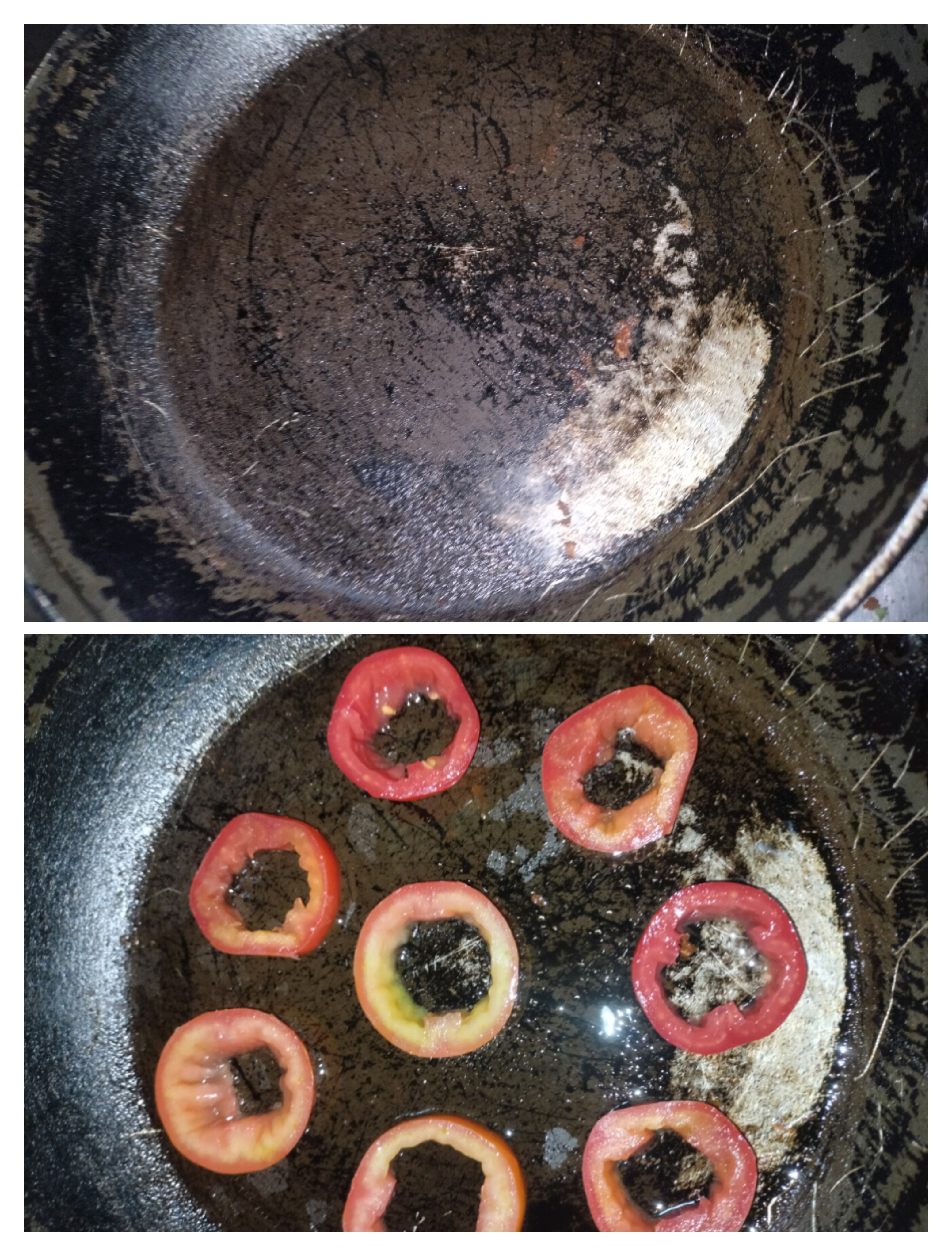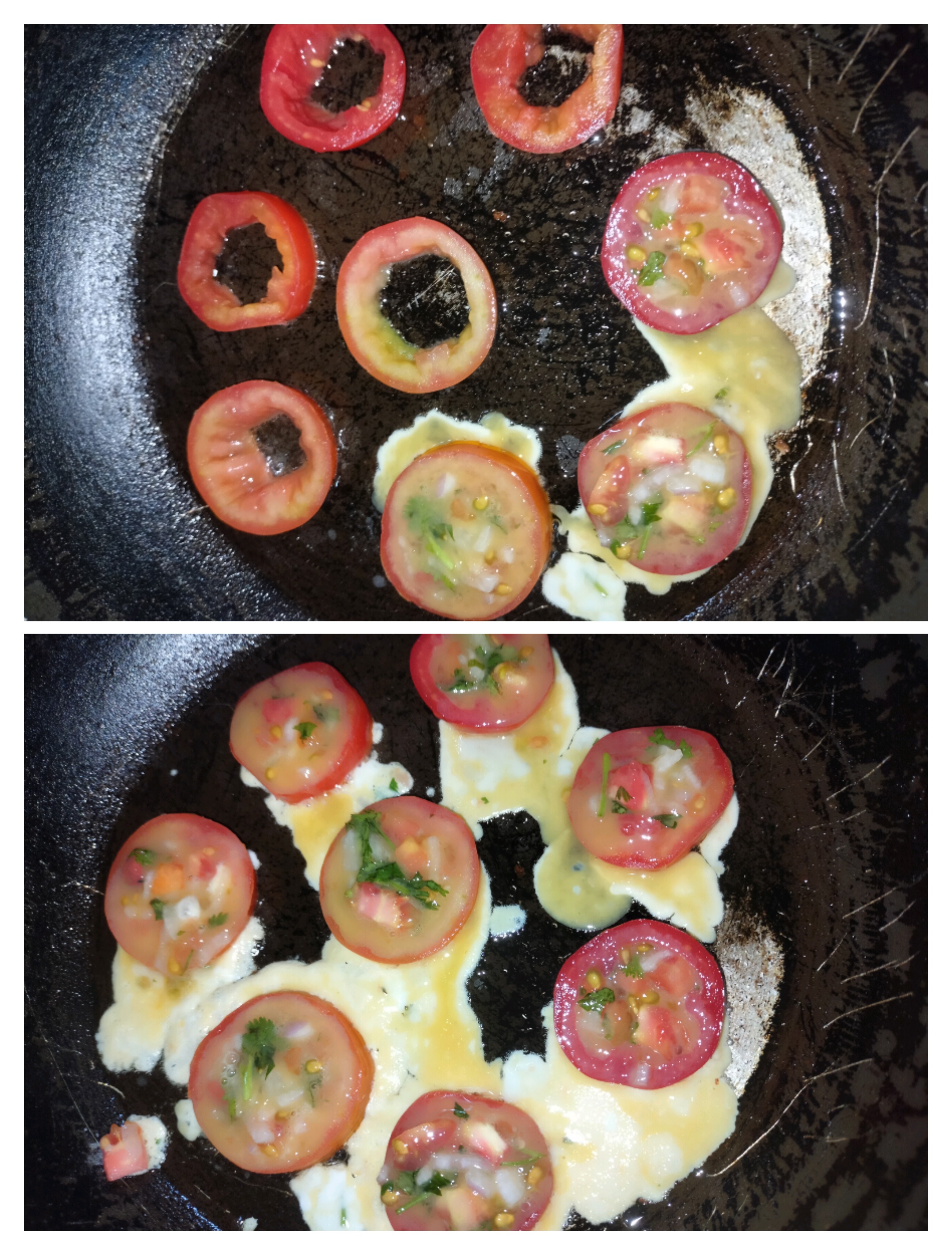 চুলায় আমি একটা ফ্রাই প্যান্ট বসিয়ে দিলাম। এর মধ্যে আমি পরিমাণ মতো তেল দিয়ে দিলাম। এরপরে এরমধ্যে টমেটোর টুকরোগুলো বসিয়ে দিলাম। এর ভেতরে আমি একটু একটু করে ডিমের মিশ্রণটা দিয়ে দিলাম।