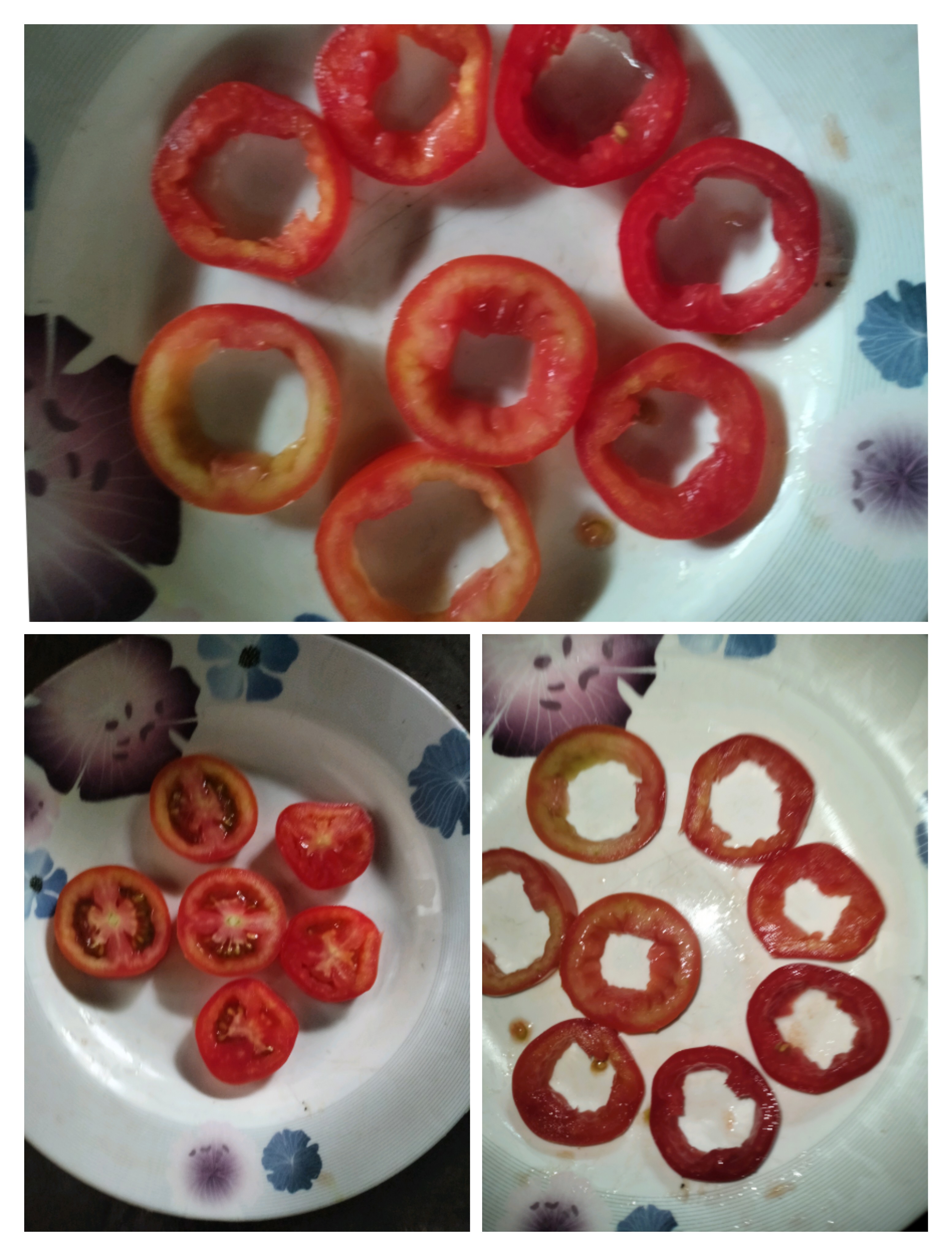 প্রথমে আমি টমেটো গুলোকে গোল গোল করে কেটে নিলাম। এরপর টমেটোর ভেতরের অংশটা নিয়ে নিলাম।