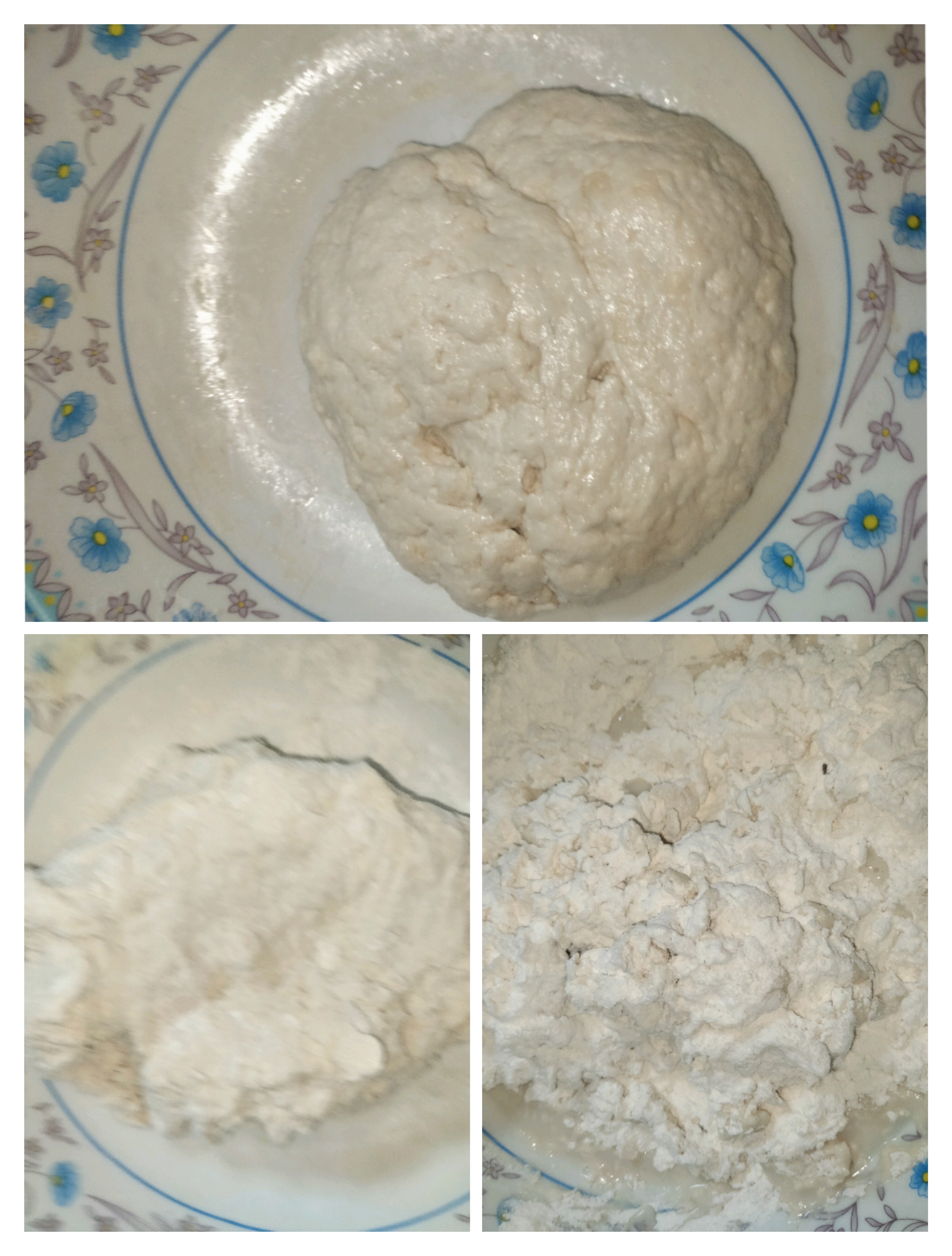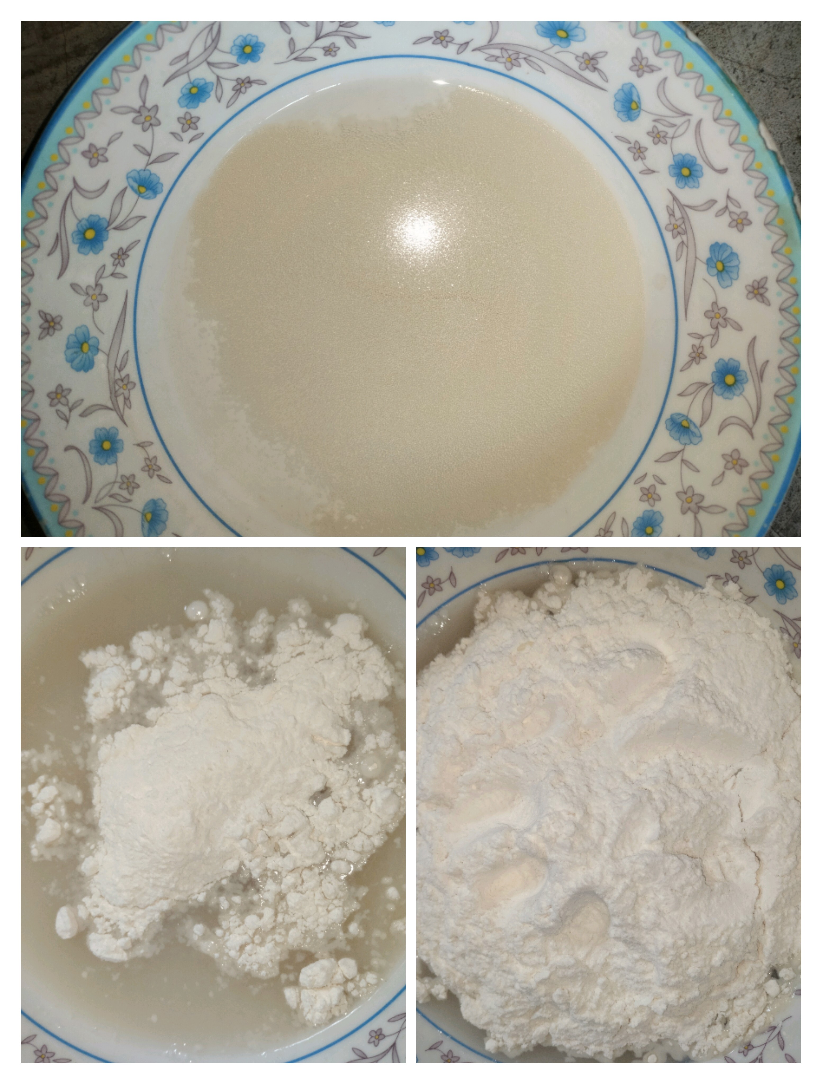 প্রথমে আমি একটি বাটিতে কিছুটা পরিমাণে পানি নিয়ে নিলাম। এরপরের মধ্যে ইস্ট দিয়ে দিলাম। এরপর এর মধ্যে অল্প পরিমাণে করে আটা দিয়ে দিলাম।