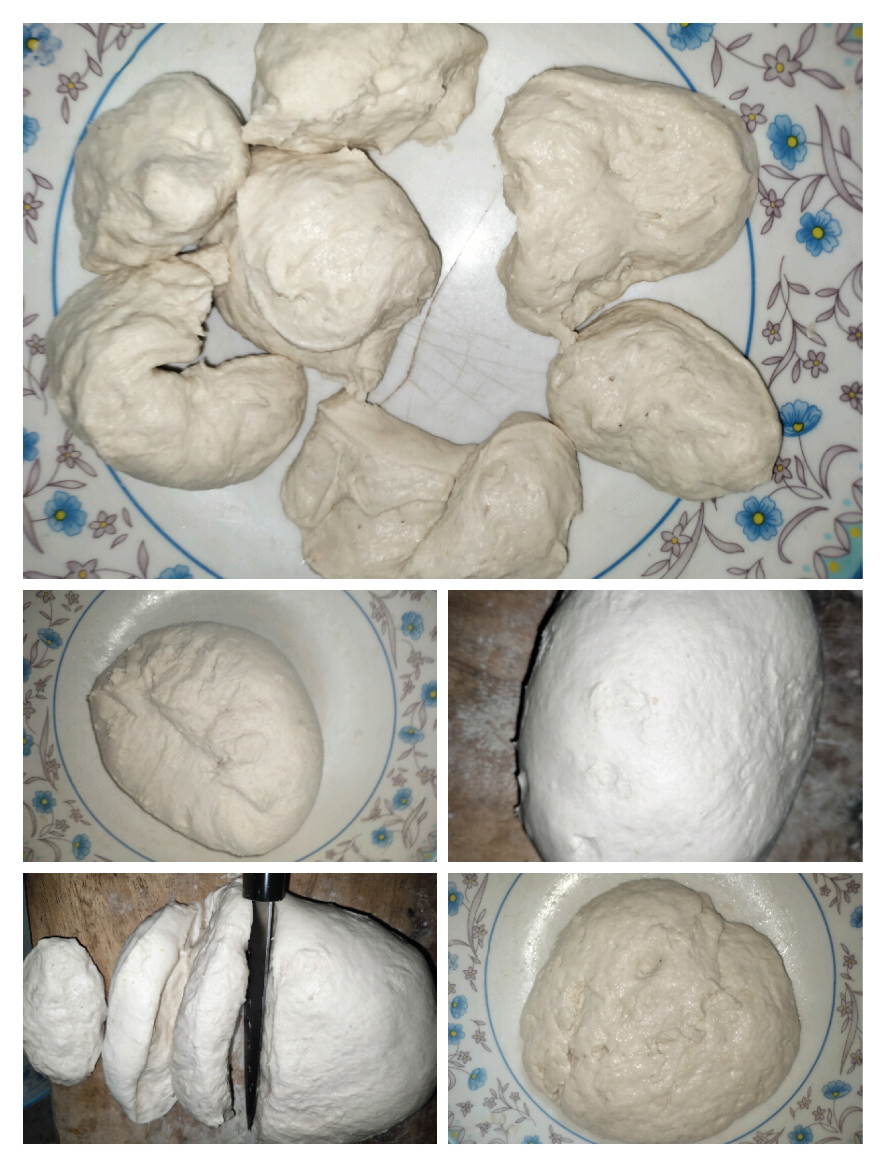 এরপর আমি ঢাকনা দিয়ে ঢেকে রাখা ডোটাকে দেখব অনেকটা ফুলে উঠেছে এরপর আমি কিছুক্ষণ হাত দিয়ে মথে নিব। এরপর এটাকে আমি কয়েকটা ভাগে ভাগ করে নিলাম।