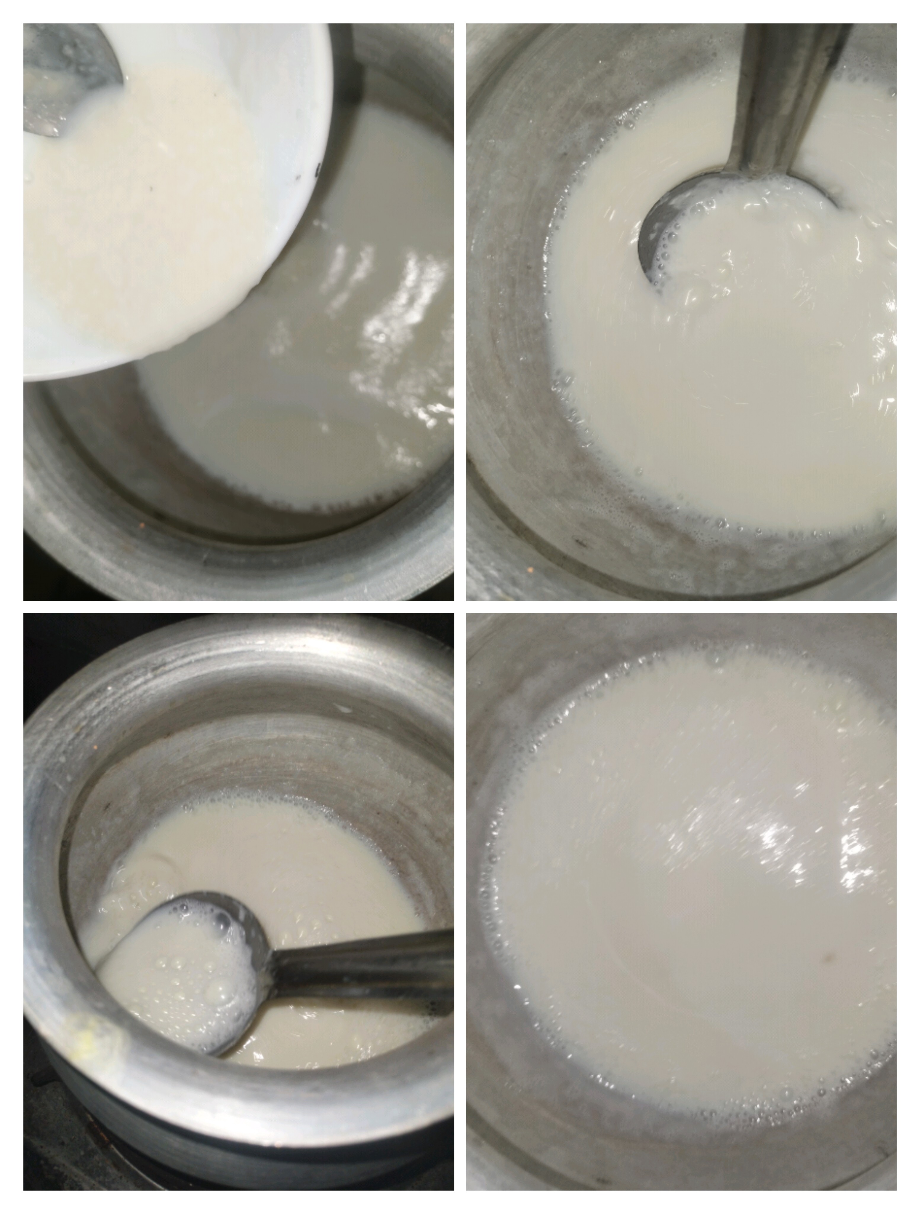 এরপরে আমি দুধের মধ্যে আগার আগার পাউডার মিশানো দুধ টা দিয়ে দিলাম।