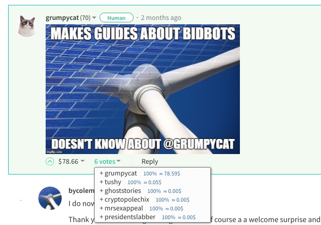 So the story continued when about a month later grumpy cat posted up this Non-GumpyCompliant vote sellers are now to be used exclusively to profit from the reward pool!So more or less what Grumpycat was saying in this post is the latter of the bid bot owners had accepted his or her demands, bar one @sneakyninja who refused to give in to the demands asked for.