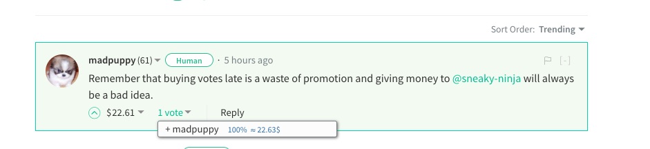 Further more Grumpy Cat set up an additional account madpuppy, and pumped money into the account to also look to flag (non compliant) posts which were not following grumpy cats demands. Grumpy of course upvotes all mad puppy's comments and mad puppy upvotes all of grumpy cats comments in addition to their self upvotes.