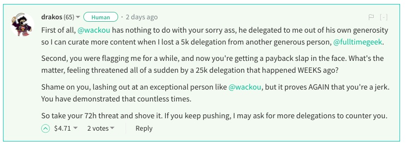 Witness @drakos has recieved a delegation from @wackou, drakos is a witness and does a lot for the platform. After all his hard work he has been rewarded with some delegation and rightly so. But at the same time Drakos has downvoted some of grumpycat and madpuppy's post.