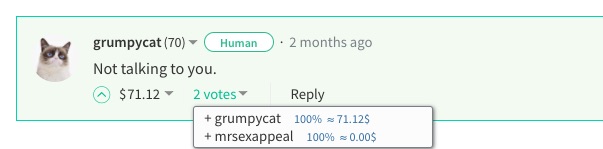 But sadly it did not stop there oh no far from it. It would appear that regardless of who it was, that chose to break this rule that grumpy cat made would be flagged. At the time Grumpy Cat had a lot of voting power, and while he or she continued to flag accounts rewarded themselves with nice fat upvotes on their own comments.