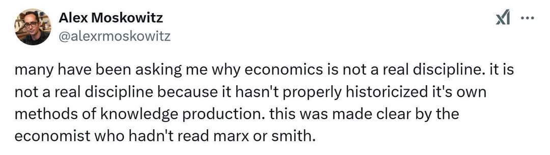 I understand the claim that for something to be a discipline it has to have continuity and self-awareness (and criticism) about that. I'm not sure the claim is true, but even if it is, there is a difference between ‘every economist must do it’, and ‘someplace within the discipline someone is working on it’ (which is sufficient).