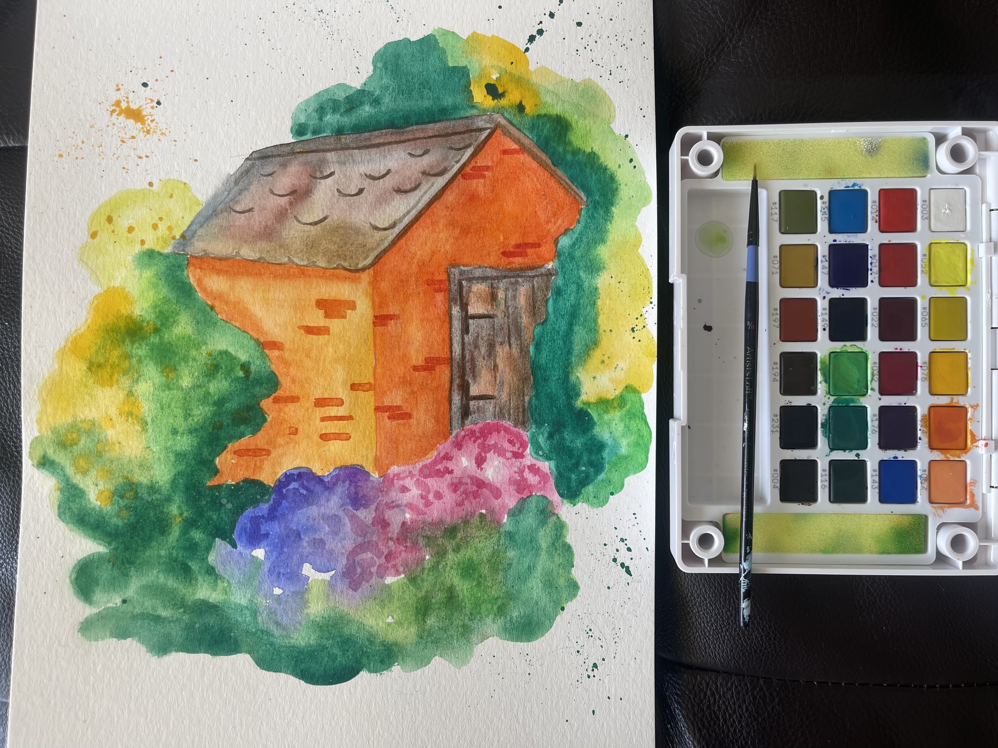 Next using variety of browns I painted the roof, and door.