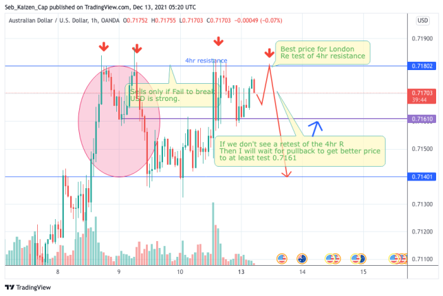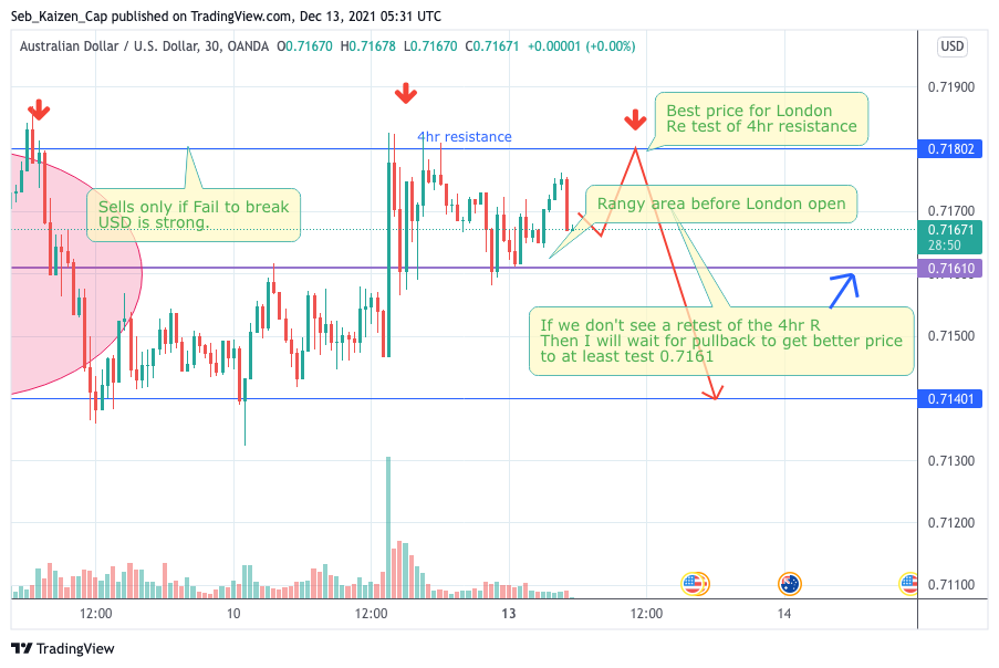 For AU and London open I'm bearish accordingly to the 4hr TF. USD is getting stronger now that Omicron fear has been taken by the market all last week and further lockdowns or economic paralysis has been discarded by the moment. I still believe that we will have some retest of the 4hr resistance before going to test lower supports. We can see or expect similar behavior as the circle on the left. (SL above 4hr wicks).
