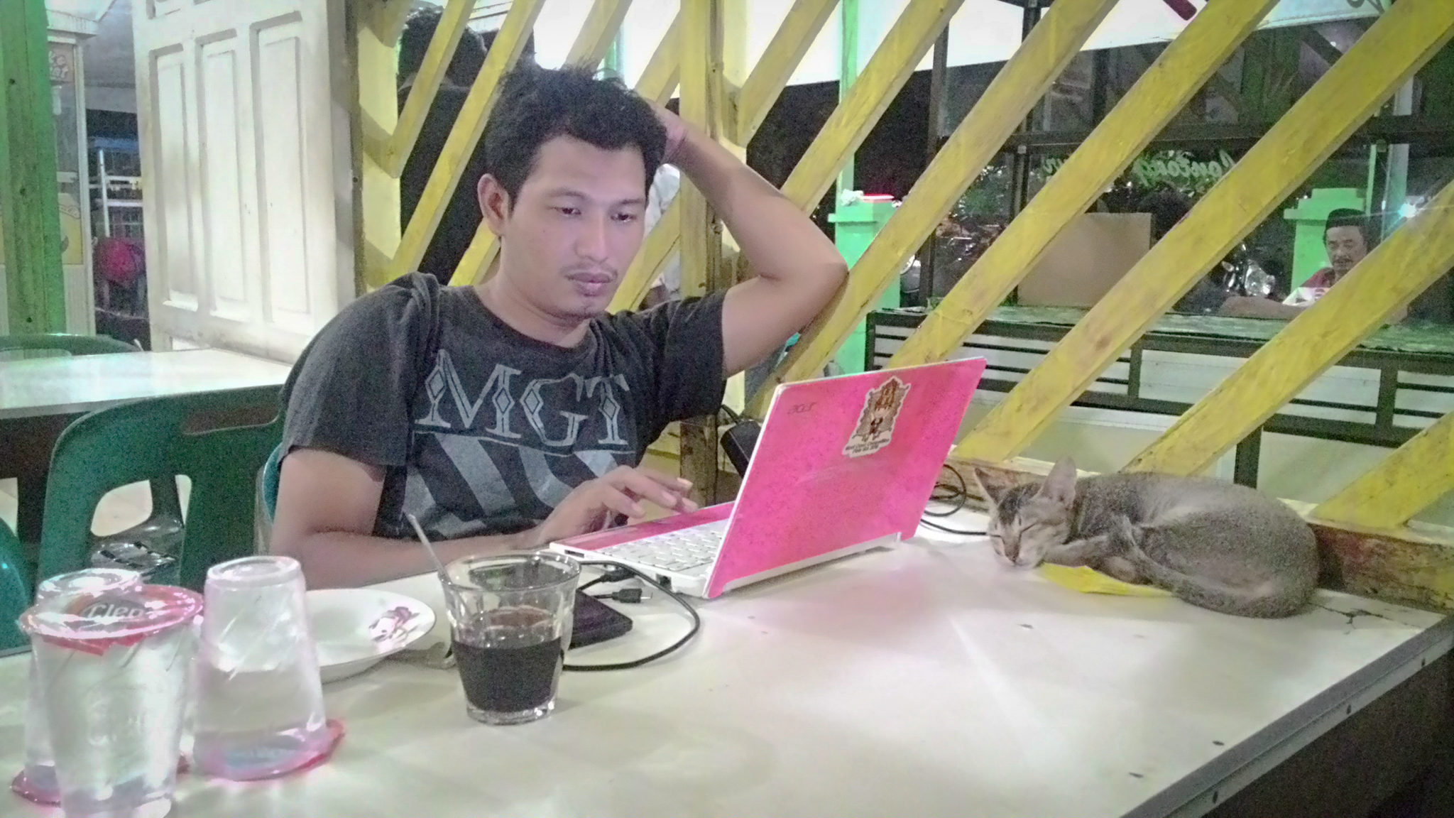 The cat I keep in my workplace is in coffee smea, this cat is very spoiled with coffee customers, even sometimes he fell asleep in coffee lovers.