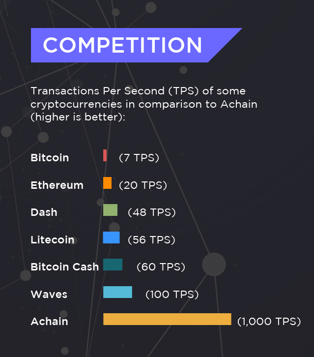 Achain has the throughput of 1,000 transactions per second. Cryptocurrencies used as payment such as Bitcoin, Dash, Litecoin, and Bitcoin Cash only have 7, 48, 58, and 60 transactions per second respectively. Cryptocurrencies used as platform such as Ethereum and Waves have 20 and 100 transactions per second respectively.
