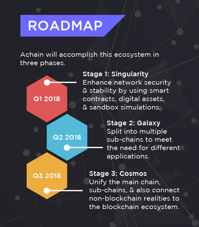 The first stage is called Singularity. This is the stage where all testing and improvements are done before deploying the application to the main network. The second stage is called Galaxy. This is the stage where chains are being split to sub-chains to satisfy the different uses of various applications. Achain currently is in the Galaxy stage. The third stage is called Cosmos. This is the stage where the promise to connect the main chain, sub-chains, connect blockchain technologies from each other, and even link blockchain and non-blockchain realities.