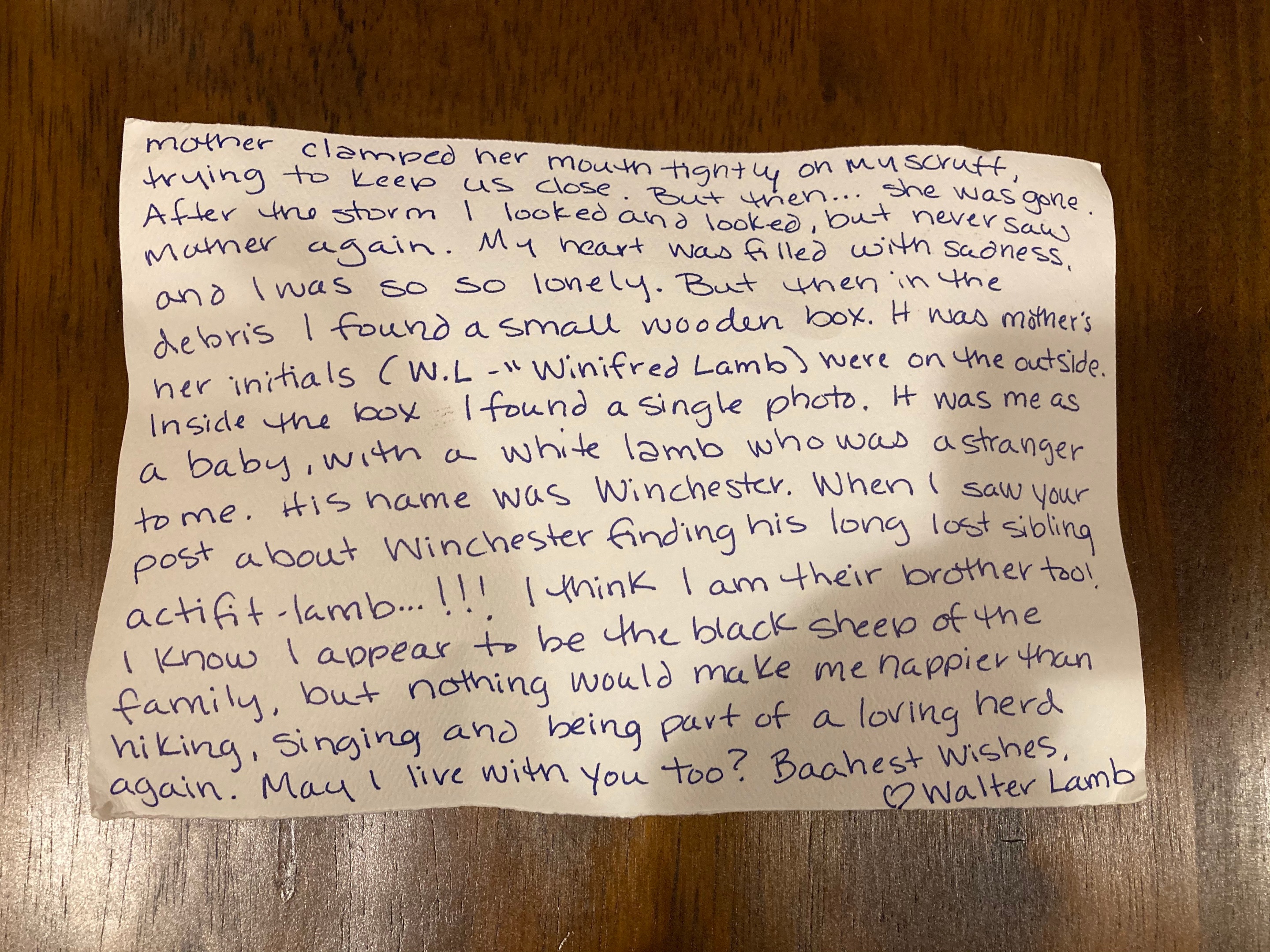 Mom was stunned as was I and Winchester! We had another brother! She had another lamb! Not only that, but his name is Walter, which begins with a W as does all of ours do! Can it be?