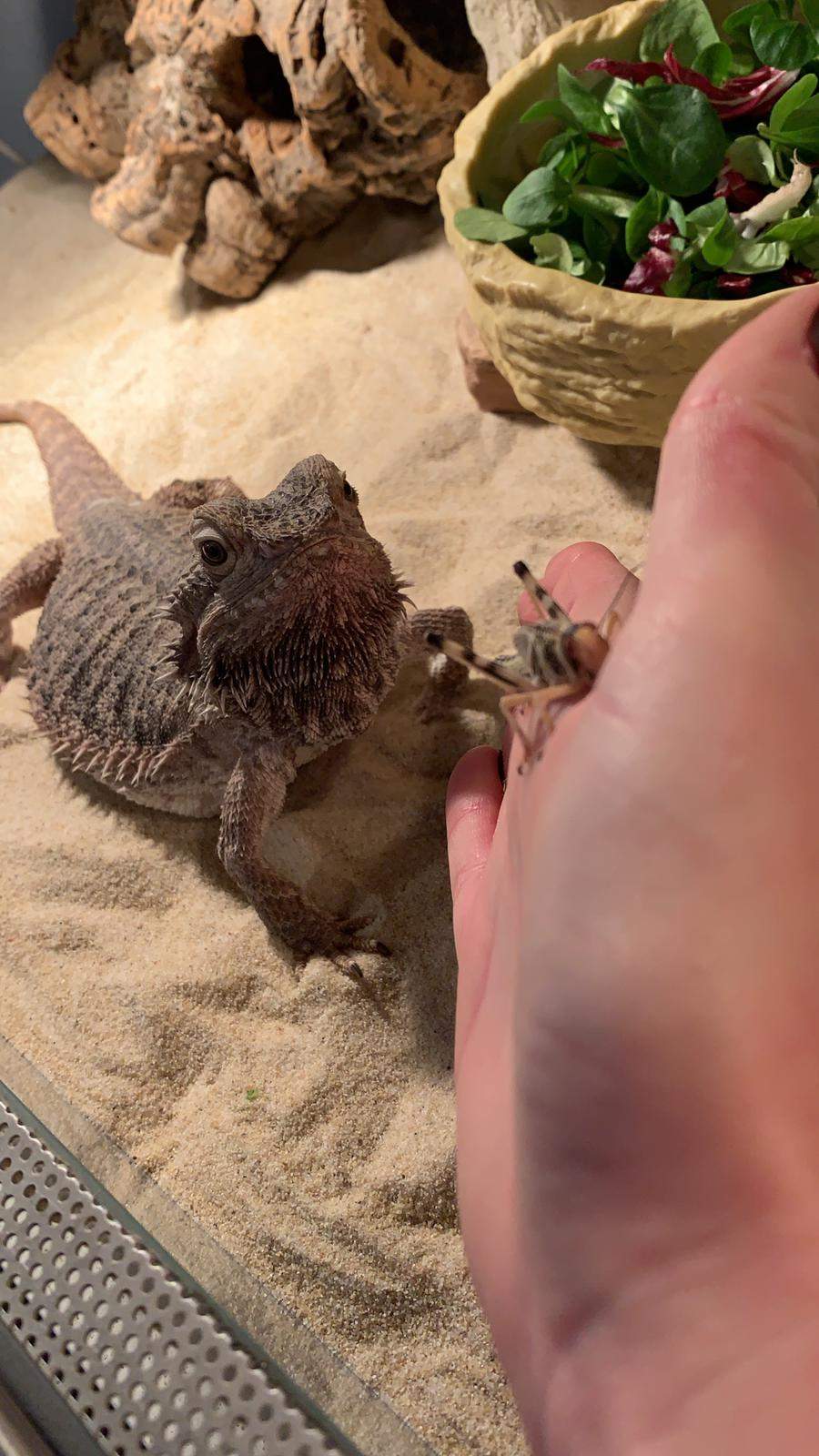Der ist eigentlich eine sie, soweit ich weiß frisst sie nicht so besonders viel, meist gibt es Salat und dann und wann auch mal Heuschrecken🦗