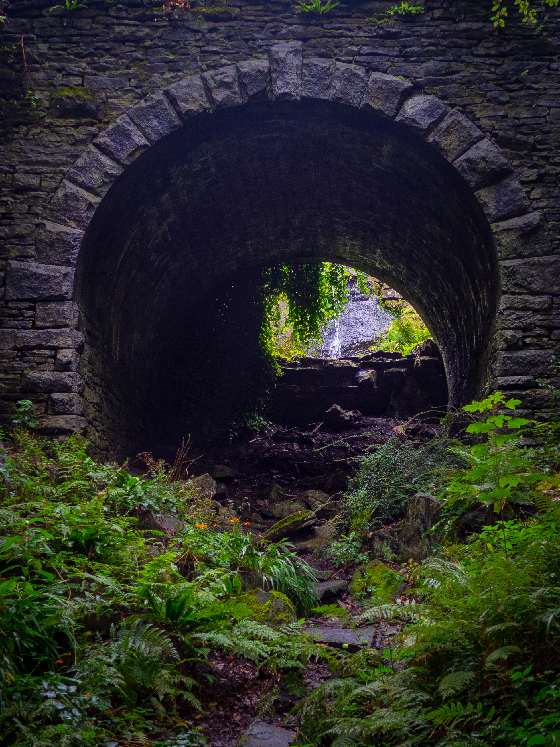 We peer up through this tunnel that cuts under the concrete path on the upper tier. There's a small water feature up there which water runs off which you can see at the end of the tunnel.