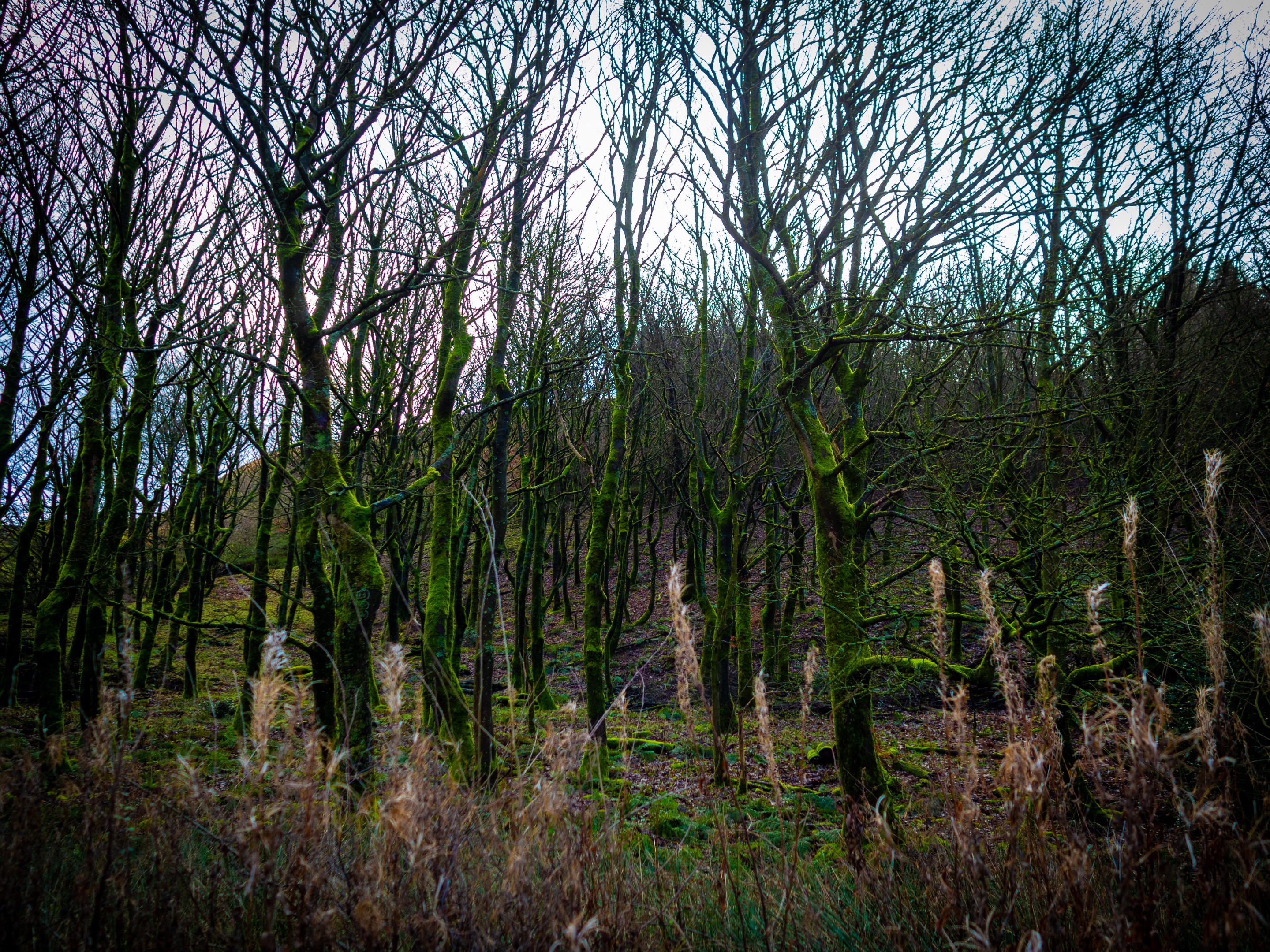 The walk begins on a road alongside the reservoir. The res is on our left, and there are some woods to our right. The trees are fully bare now winter has set in. The trunks are covered in moss making it appear like the grass is growing up from the ground and encompassing the trees.