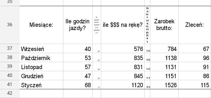 czyli coś między 800 a 1200 ale jeżdżę tyle ile jeżdżę. Na cały etat było by znacznie więcej tyle, że wtedy trzeba by dzień w dzień pracować do 19 a czasem 22.