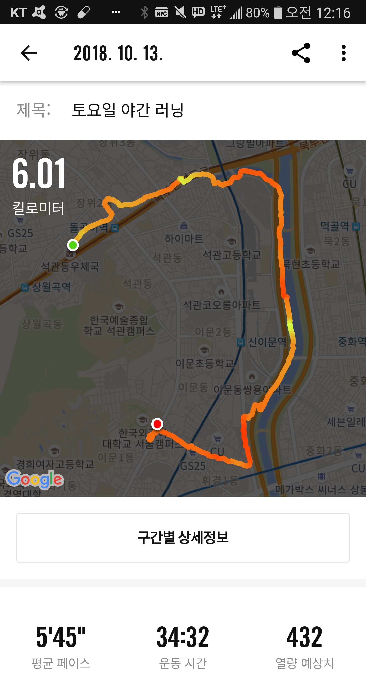 상월곡에서 저 루트로 뛰면 딱 6키로구나