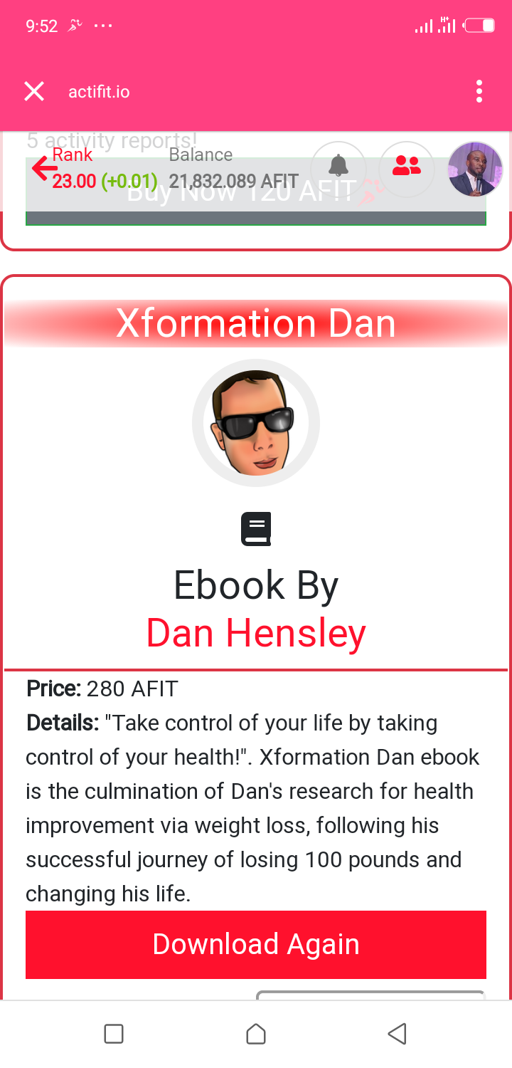 Over the last few months of using actifit Dapp, I jave earned over 20,000 AFIT tokens which is worth over 1,000 steem, and that's equivalent to $250. Moreover, I was able to purchase a tangible product worth 280 AFIT. It was actually a health guide put up by @theycallmedan, a crypto investor, an influencer fir Steem and co-founder of the @threespeak Dapp.