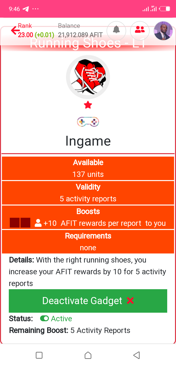 Moreover, i also maximized the "Running Shoes - L1" product. This product is visualised as an in-game shoes which promised to increase AFIT rewards by 10 for the next 5 reports.