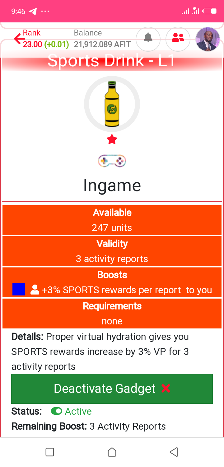 The first product I purchased was the "Sports Drink L1". This is a virtual hydration product which gives SPORTS rewards of actifit reports by 3%VP for the next three actifit reports. I probably went for this as my first product from the actifit market based on my love for SPORTS token and I'm seeking to reach 10 million stakes in the near future.
