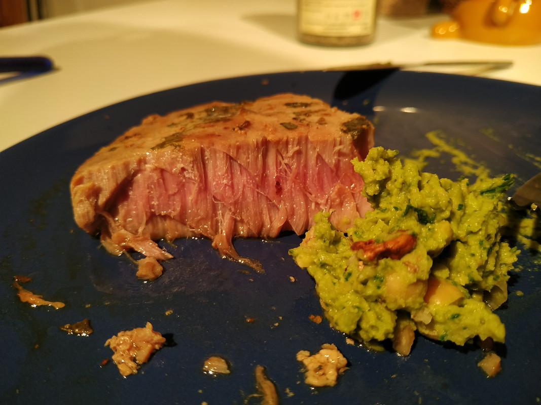 Before I remembered I could take pictures I ate almost all my tuna steak and that delightful humus. I was so happy with the preparation and the culinary knowledge of my friend. He marinated tuna in basil, a little bit of oregano, olive oil and a little bit of butter. I was amazed how tender it was at the end and because of that, I forgot to take a picture at the right time. Here is a picture of my almost finished meal