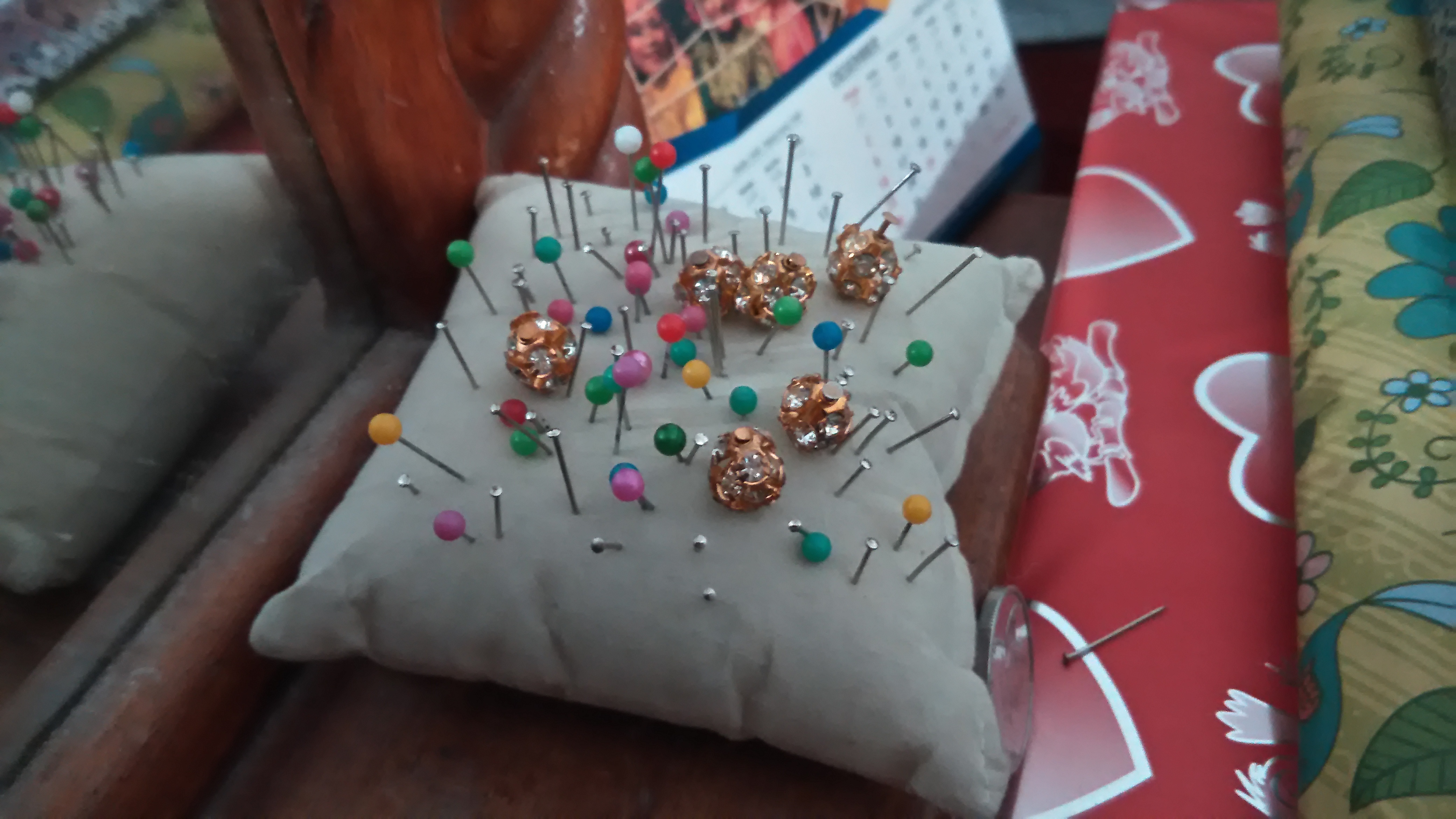 Baiklah. Berhati-hati, satu persatu atribut penghias kepala itu saya lepas. Ikatan di sana-sini tertahan oleh pentul di sana-sini pula. Untuk menahan rangkaian bunga melati, untuk membentuk kain tulle berwarna emas yang dijadikan jilbab, ditambah untuk menyemat sepotong kain brokat motif bunga sebagai tambahan hiasan lainnya di di bagian kepala yang diatur sedemikian rupa di atas kain tulle tadi. Untuk ukuran standar satu kepala saja, cukup banyak sematan pentul yang harus dilepas. Saat melakukan kerja melepas pentul demi pentul penyemat hiasan kepala itu, yang bermain di benak saya adalah, bagaimana kalau kejadian sang pengantin perempuan ini pingsan atau terjatuh dan rebah kepalanya? Betapa resiko tercucuk pentul sebanyak itu sangat besar sekali kemungkinannya.