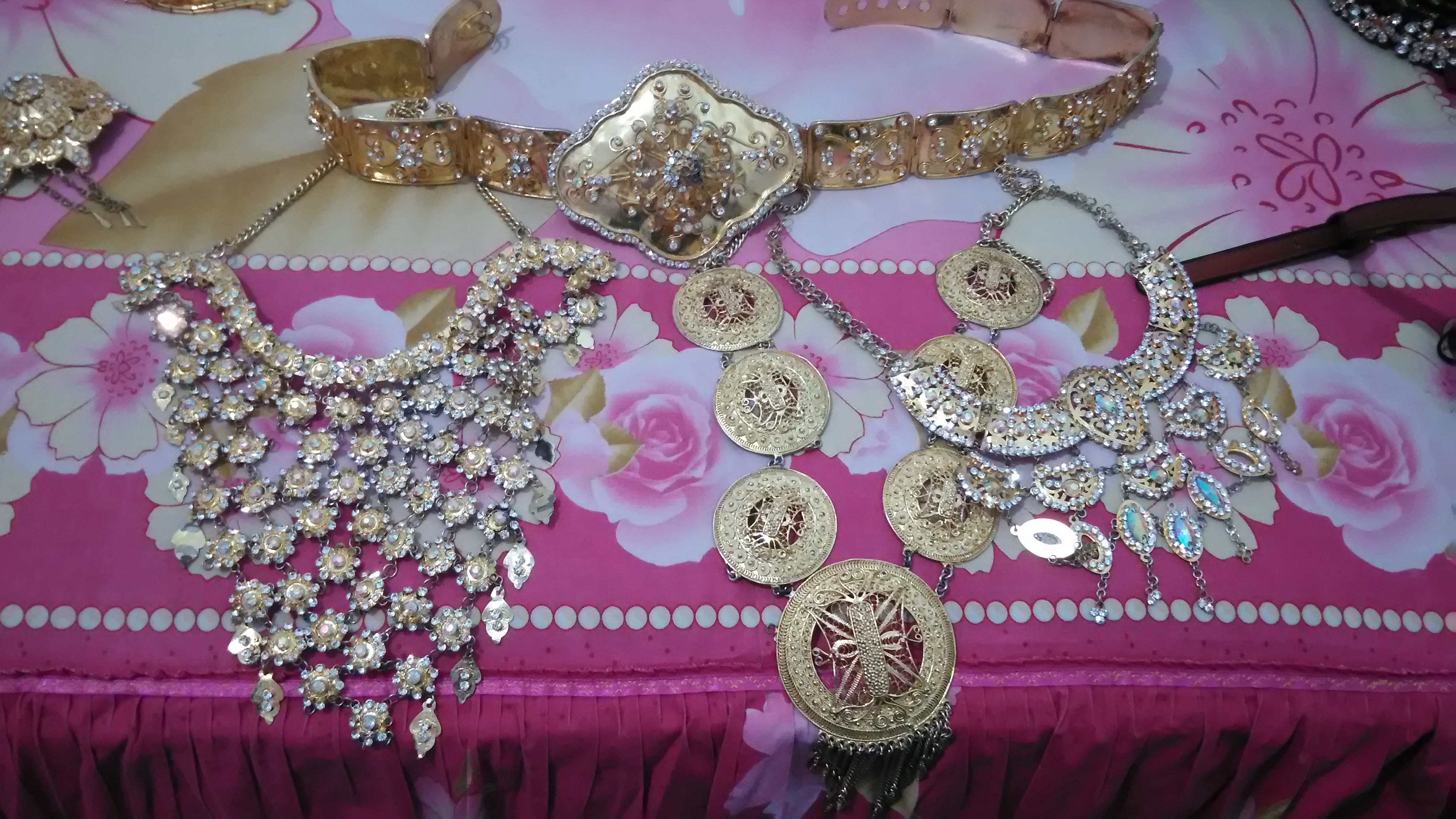 Hei, itu baru di bagian kepala. Belum ditambah beberapa jenis kalung yang menggelayuti leher, ragam perhiasan di tangan, pinggang, sampai kaki. Komplit. Bila ditimbang-timbang secara kasar, bisa jadi berat keseluruhannya lebih dari 6 kg.