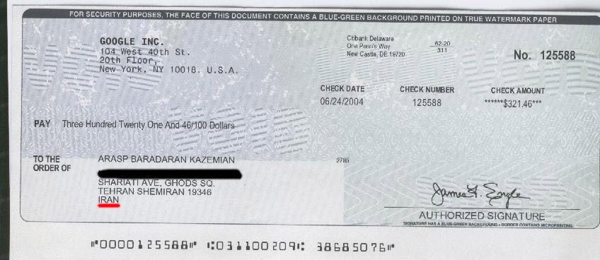2- Look at the address where the AdSense check is sent! Iran! Did you know Iran is under USA trade sanctions since 1979? So what the heck is this? How could I force a big company like Google to send an official check to a banned country? Today you cannot see Iran in the list of many services provided by Google. (Including Adsense and Adwords)