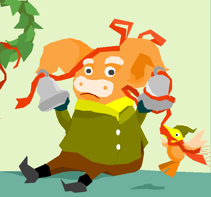 My art shows the poor little orange piglet with his sad long face probably because he misses someone. Do not worry though as the little yellow birdie is here to keep him company. The bells he holds with both hands and the red long bow around him makes this scene really funny and entertaining. I hope you like it.