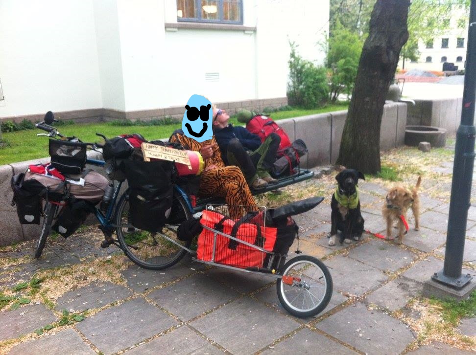 I set up the tent and didnt even sleep that night. There happened to be a techno party in the carpark behind the gas station. Car we with soundsytems and the boot open blasting out tunes. Reminded me of the old days somewhat! At around 2am it started to quieten down, but then someone arrived with a generator! The next morning I was so tired I decided to find out if there was a train from Askim to Oslo,and there was! We went to the train station easily and I had no money to buy a ticket and decided just to risk getting asked to leave the train before Oslo. Any amount of Kms would save me a ride! It was really early in the morning at the train station and we had some time to wait,I wanted to go to a toilet and saw a hotel over the road. I went to ask bout a toilet as the door was open but it seemed the whole place was shut, it was quiet nobody around, with a breakfast banquet laid out which made my mouth water badly. Then from a distance I hear someone start whistling a tune, and I went to to find them to ask about a toilet and maybe to buy a coffee. I meet a startled guy, he was working alone and told me the place was actually shut but would open in an hour. I went to the toilet and asked about a coffee. He said that I could just take a cup from the room with the breakfast stuff in it, and walked off, leaving me stood in a hotel dining place. Next to the coffee was bacon and scrambled eggs, fried tomatoes, mushrooms, a full layout hot buffet. I got a coffee and of course ate quiet a bit of food too. It was by far the best place I had asked about a toilet at before! I went back to the bike an the dogs at the train station and we got on the train and then it stopped after some minutes and someone told me the trains was cancelled and there would be a bus replacement instead. The bus turns up but the driver is heavily allegic to dogs and so they call a taxi for me. A Mercedes van turns up and I was sure we would get me , the dogs, the bike, and the trailer all in but we did, and 20mins later we were off driving to Oslo! Nobody even asked me for a ticket! Free Breakfast, Free train and a Free taxi, all before 9am in the morning!