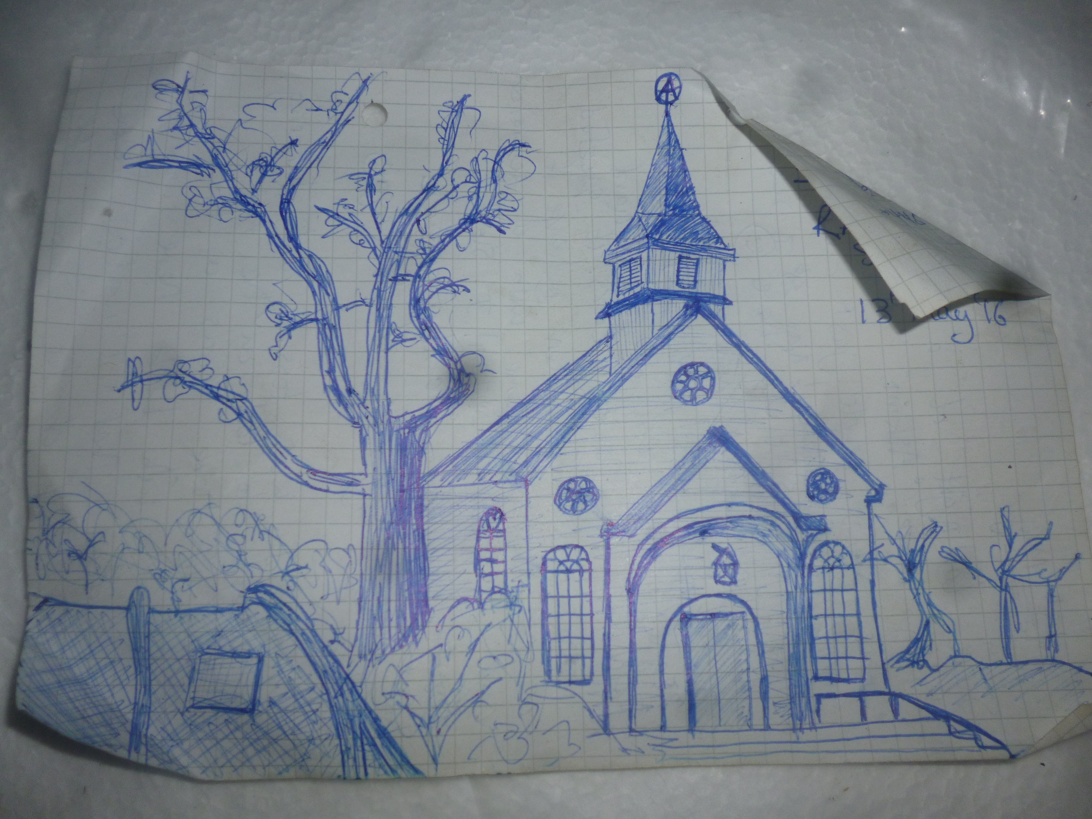I rode up the main road from Halden, occasionally taking country roads but learning that the main road was much flatter and easier to go along. Halden was dead, had hoped to play some music there but didn't get to. The church was quiet breathtaking and it was the first Norwegian church I had ever seen apart from in a book on old wooden Scandinavian churches I once read in Germany. I was travelling with no camera and drew a pic of it whilst sat on the bench next o my tent. I had never really drew anything before because its not really my thing, but decided to for this trip.