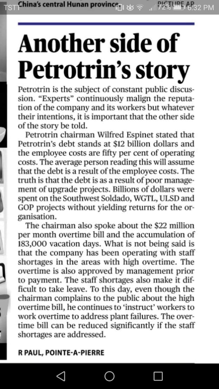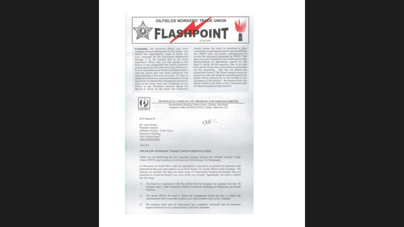 TO BE READ IN THE PAPERS - https://newsday.co.tt/2018/07/15/owtu-tells-petrotrin-stop-violating-the-moa/