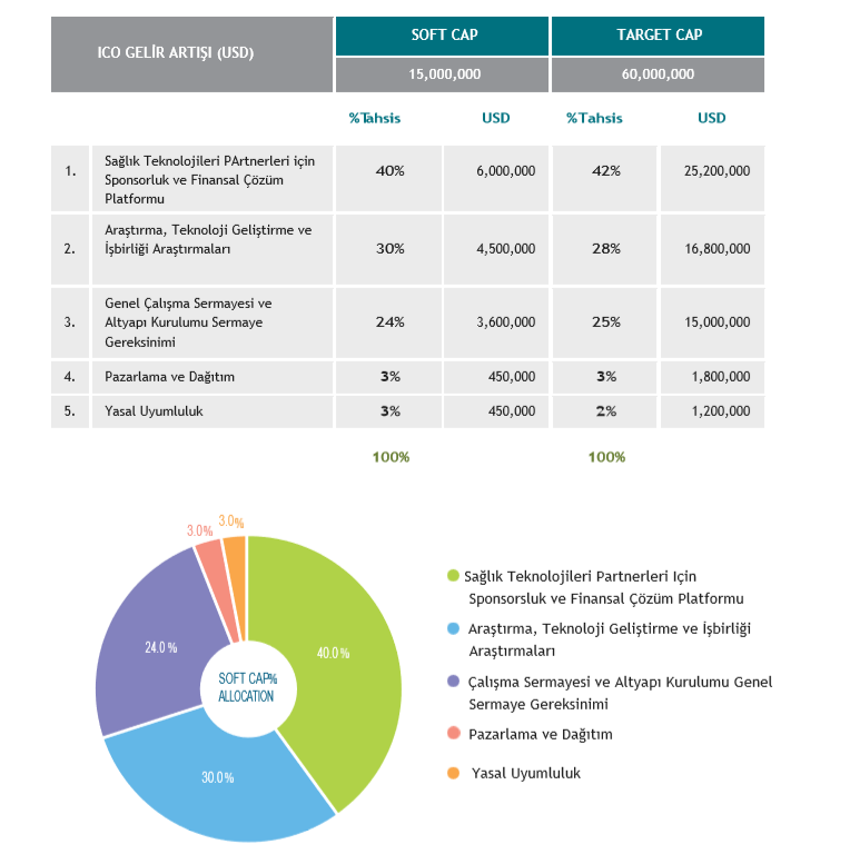 Yukarıdaki grafikte hedeflenen hacim bilgileri verilmiştir.İkinci grafik; token gelirlerinin nasıl ve hangi amaçla kullanılacağı belirtilmiştir.