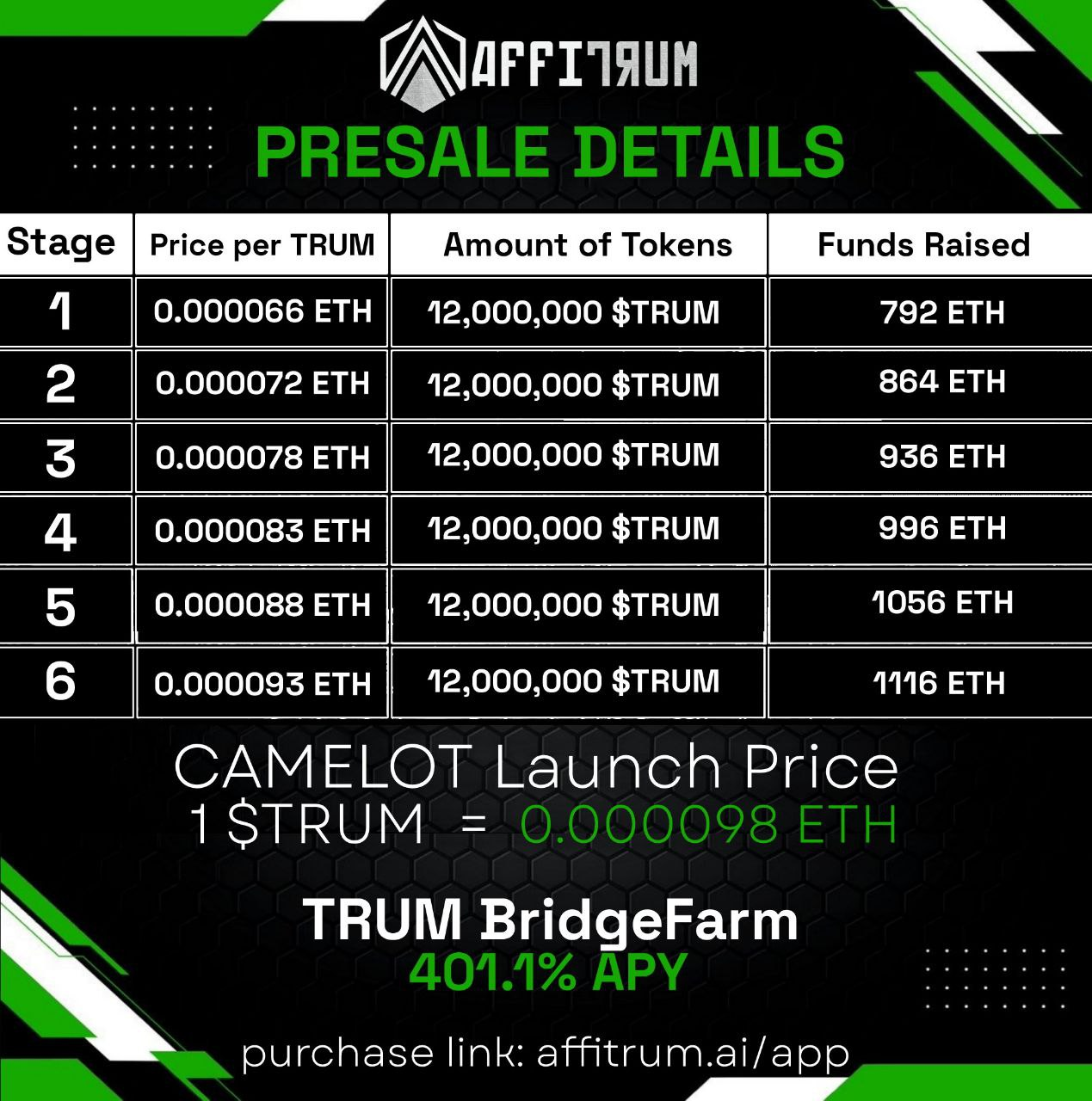 Presale price per token: 1 $TRUM = 0.000072 ETH (ARB CHAIN ETH)