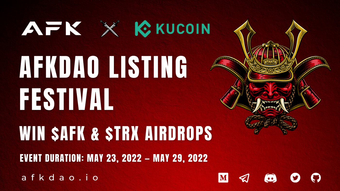 Upang gunitain ang AFKDAO nalista sa KuCoin, gaganapin ang isang airdrop paligsahan simula, sa Mayo 23, 2022. Mag-sign up para sa KuCoin gamit ang link na ito https://www.kucoin.com/r/rf/MH75Mg at manalo ng AFKDAO & TRX airdrops. Ipapamahagi ang mga reward 2 linggo pagkatapos ng paligsahan.