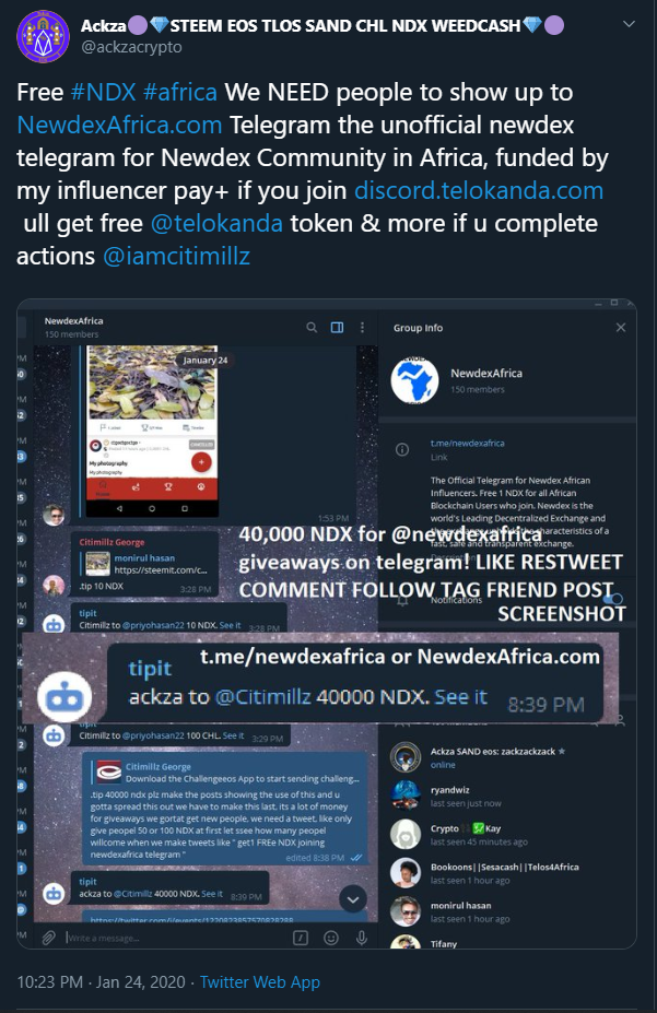 https://t.me/telokanda needs you to join the chat! You may earn 0.1 TLOS for showing us you gave an action on this steem post. Want to help us test KANDA distribution? Earn 1 KANDA for a retweet like comment of this post for @newdexafrica https://newdexafrica.com https://twitter.com/ackzacrypto/status/1220955326893023239