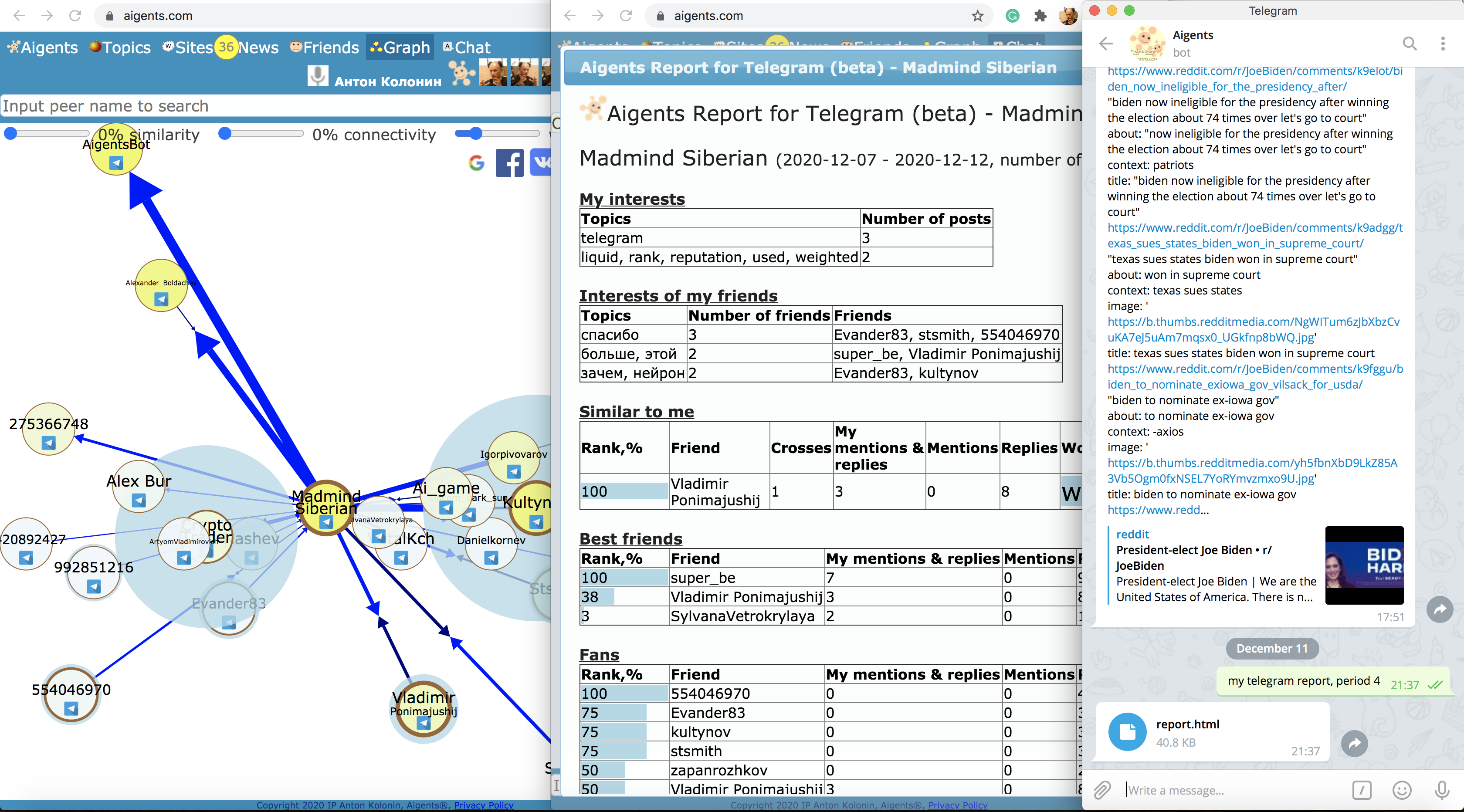 With the latest version of the Aigents bot on Telegram, you can receive reports and graphical representations of your activity and interactions with friends and colleagues in Telegram groups, automatically have an emotional response to negative and positive messages in groups, and moderate the groups using the bot. Also— you can search and monitor news on the Internet and in Telegram groups.