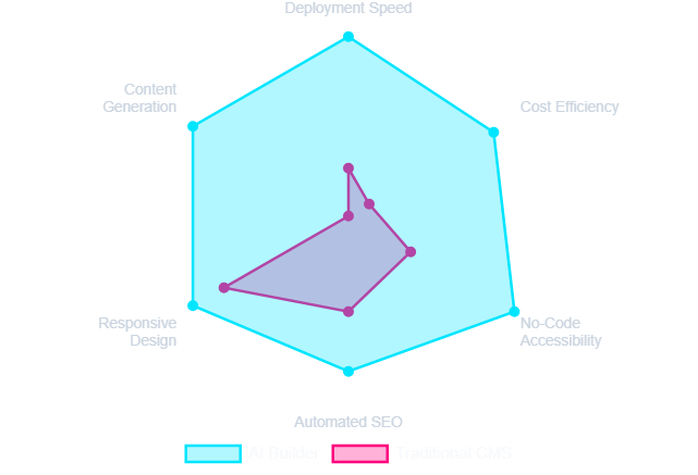 Comparing traditional CMS platforms with modern AI Builders across critical capability axes. AI scores higher in automation, speed, and integrated SEO.