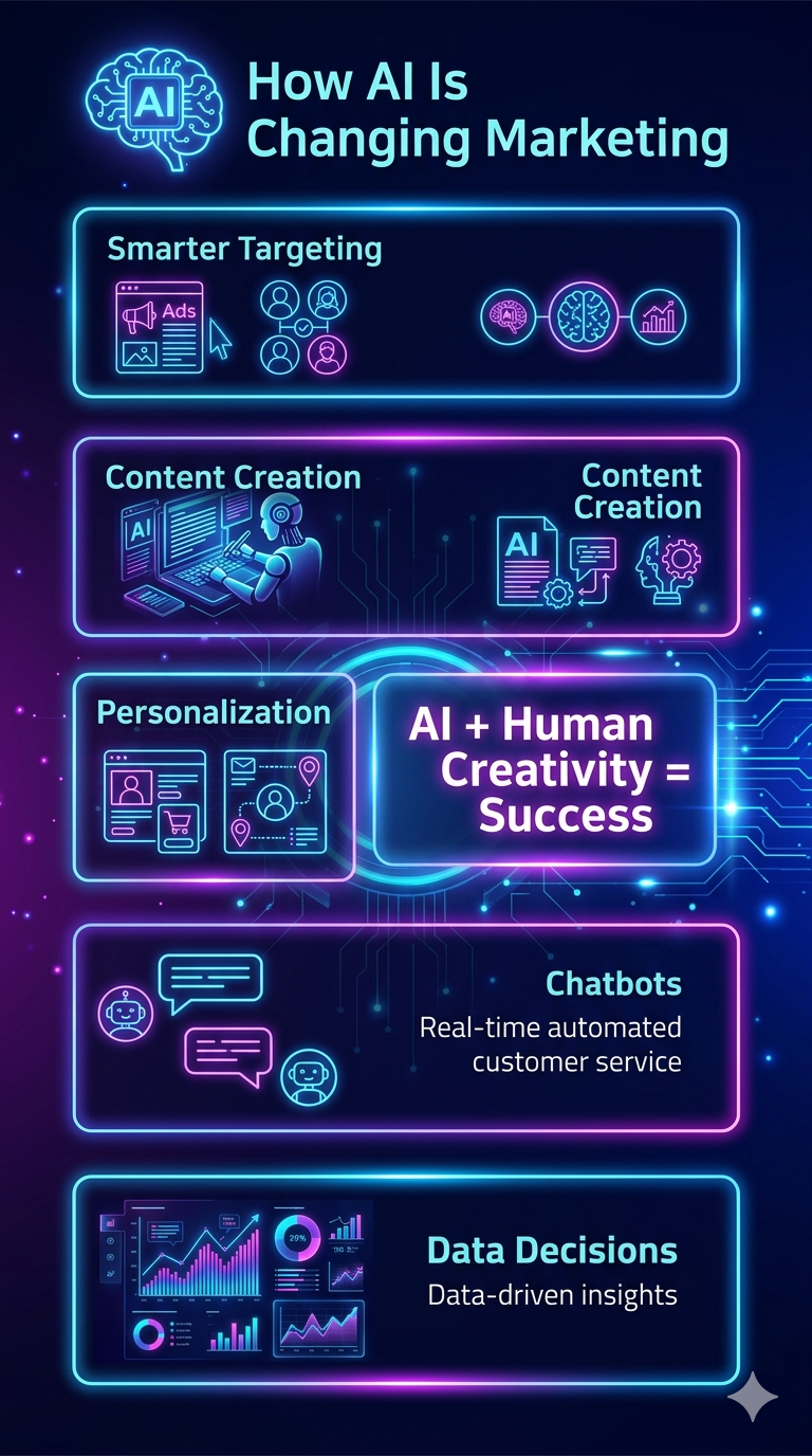 Artificial Intelligence (AI) is rapidly transforming the world of marketing. From content creation to customer targeting, AI is helping businesses work smarter, faster, and more efficiently than ever before.