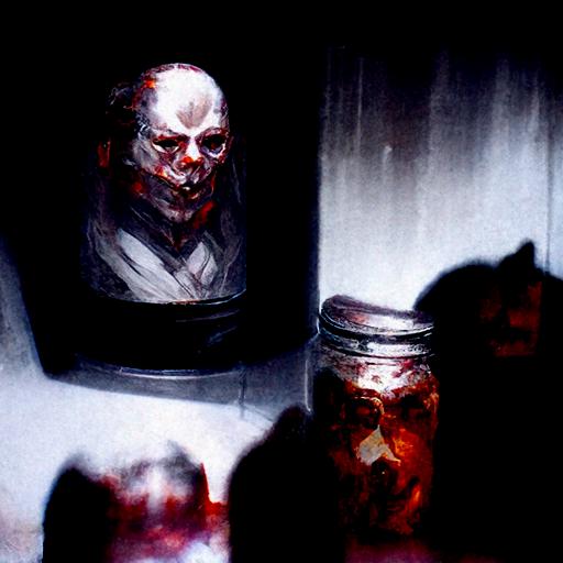 Heads in a jar on a shelf