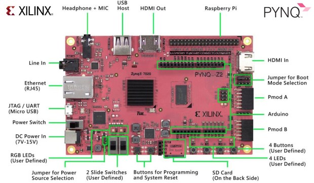PYNQ Z-2 is built around Zynq Z7020 system on chip, which includes dual-core ARM Cortex-A9 processor integrated with 28nm Artix-7 based programmable logic. This combination of ARM processor and an FPGA enables quick prototyping of programmable logic designs. What it means for you is that you can use PYNQ Z-2 as a regular development board running Ubuntu image and for parts of your application that require hardware acceleration, for example machine learning or signal processing, you can access the programmable logic using its Python libraries.