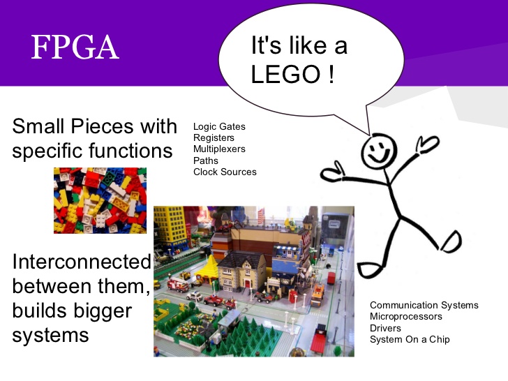 FPGA stands for field programmable gate array. Field programmable here points at the fact that their internal logic configured by a customer or a designer after manufacturing. FPGAs contain an array of programmable logic blocks, a little bit of high speed memory for holding data in use, some dedicated circuits for doing math quickly, and blocks for I/O operations, among others. If you think the name FPGA is difficult, I can agree with you on this one. You could call them “generic hardware blocks that can be completely reconfigured by software”.