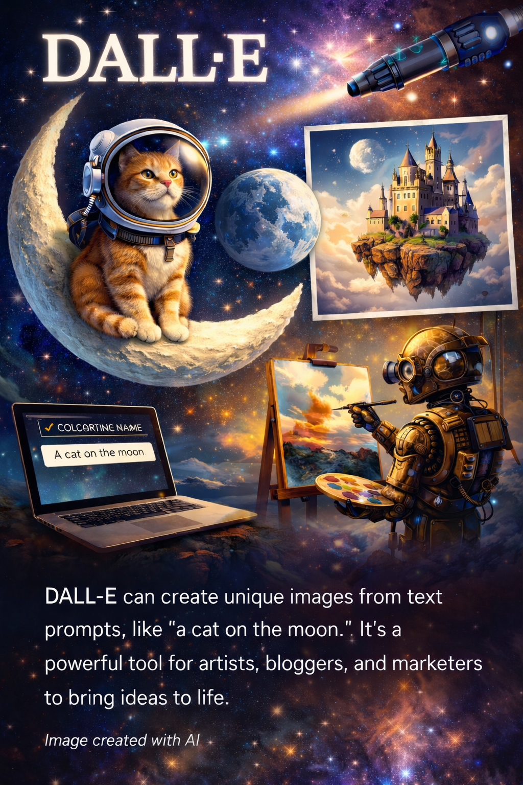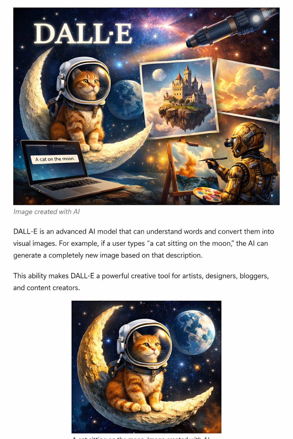 Artificial Intelligence is transforming creativity in incredible ways. One of the most exciting AI tools is DALL·E, developed by OpenAI. DALL·E allows users to generate unique images just by typing a text description. For example, typing “a cat sitting on the moon” produces a completely new and imaginative image. This makes it a powerful tool for artists, bloggers, educators, and marketers.