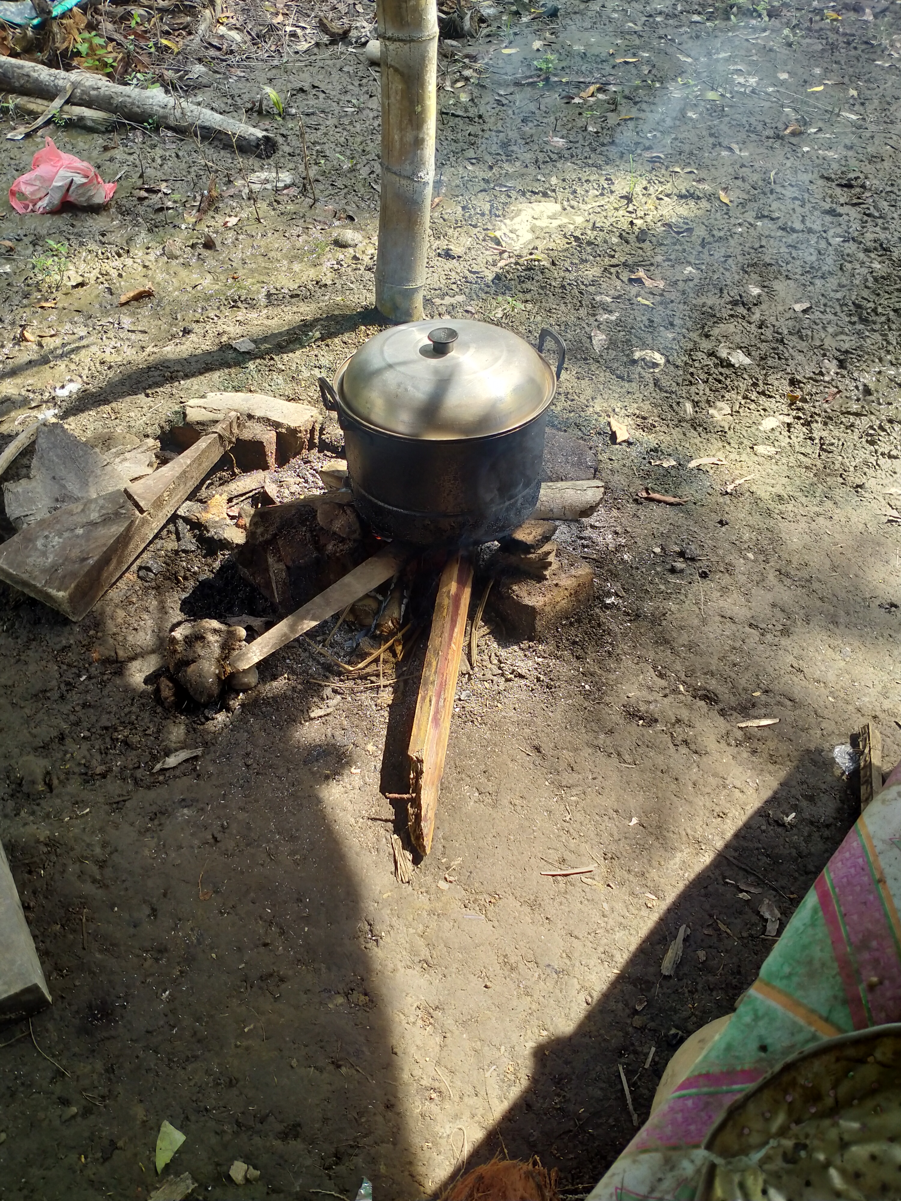 Memasak air dengan kayu bakar.