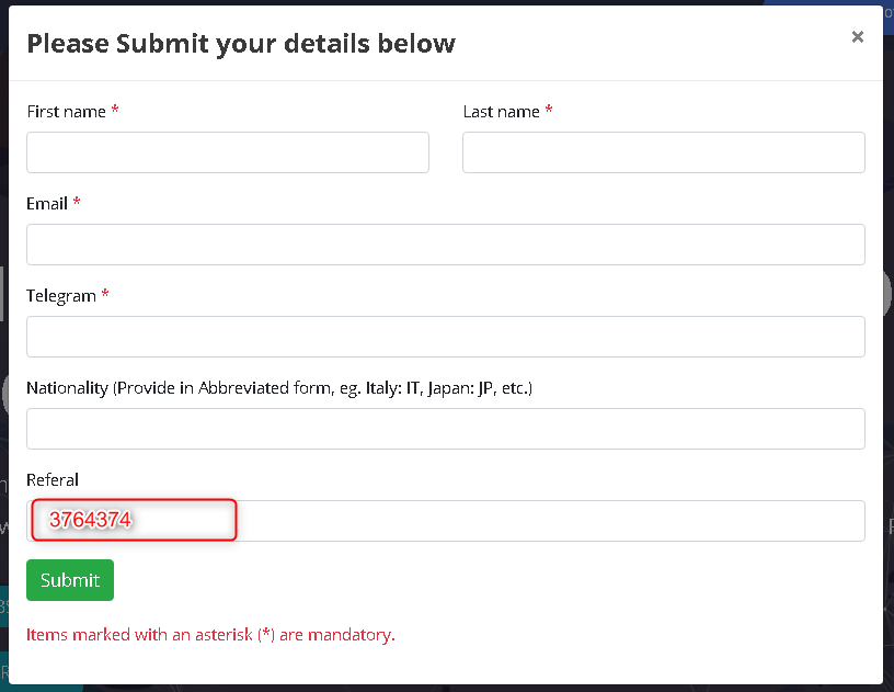 Registrate ingresando tu Nombre y Apellido, Email, Nombre de Usuario de Telegram, Nacionalidad y por ultimo en referencia ingresas el siguiente código: 3764374