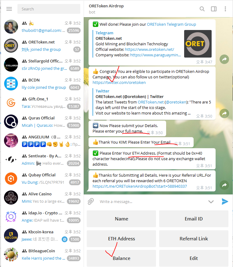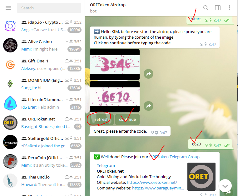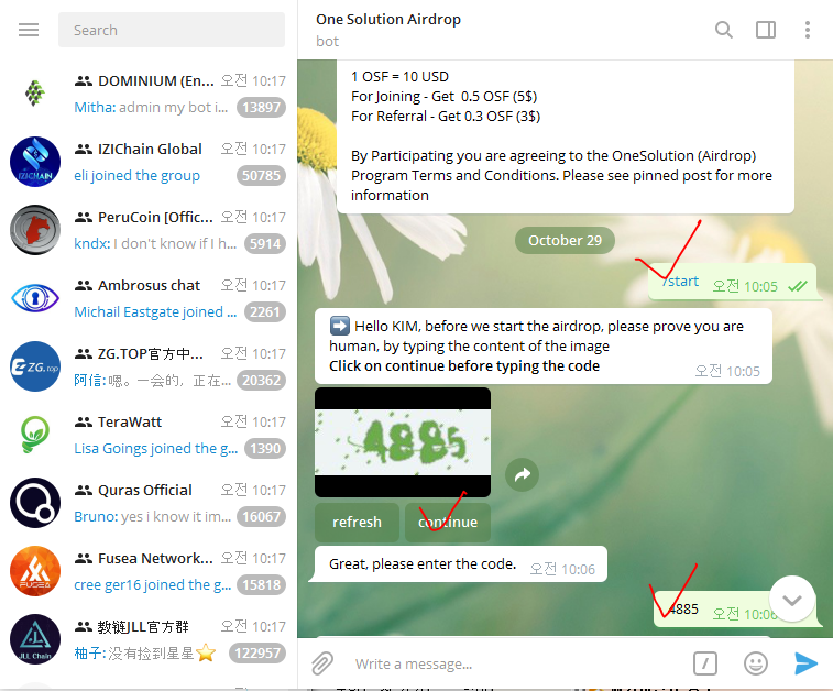 - 텔레그램 그룹 입장 후 인사말 입력
