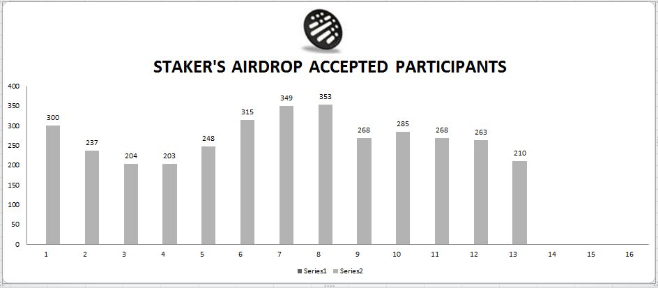 Great day guys! Today, I’m going to share the Staker’s round 13 airdrop statistics based on my PERSONAL computation. September 16, 2018 at 2:28 PM in Coordinated Universal Time (UTC), the 13th airdrop round’s spreadsheet was released by Scatter one of the admins with 210 accepted participants. This week is 50 participants lower than last airdrop as graph stated below: